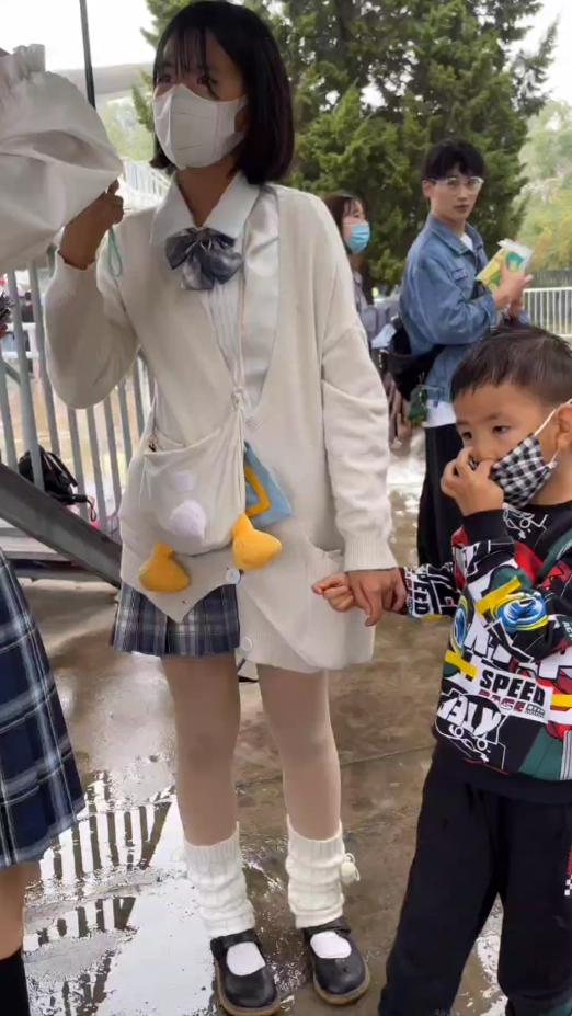 年轻妈妈带着孩子逛公园!不知道是妈妈还是姐姐!分不清!JK泡泡袜里面套着肉色丝袜!粉色N很可爱!