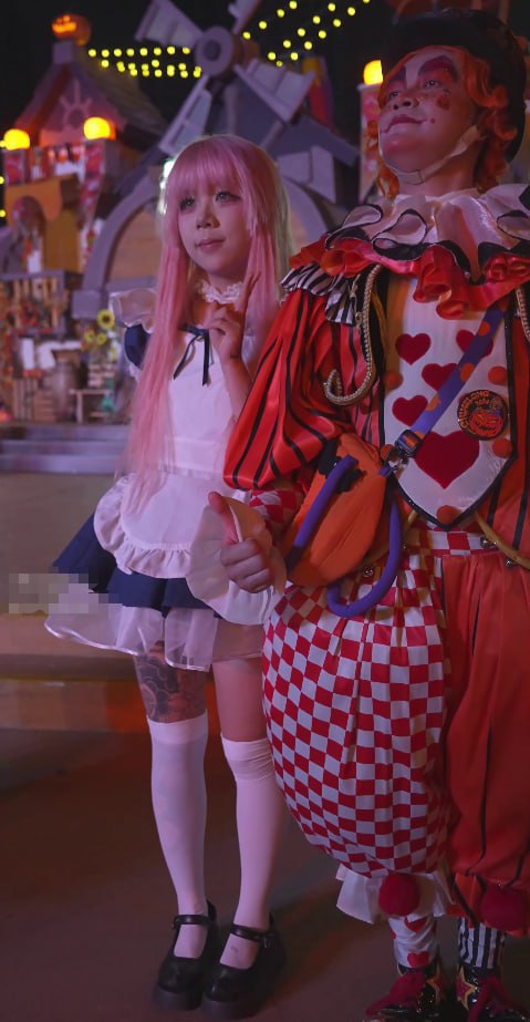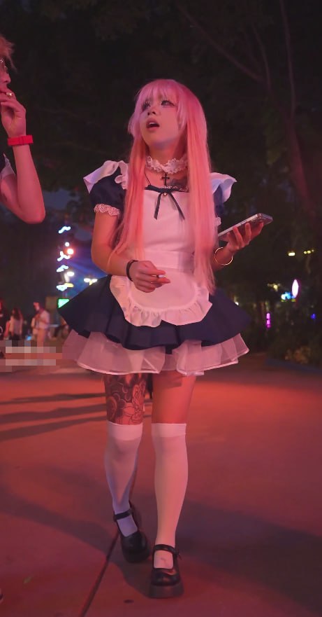 精神小妹cos粉发女仆街头失守!满身大面积纹身+白色卡通内裤骚到爆炸,抄底特写每一帧都让人血脉喷张!
