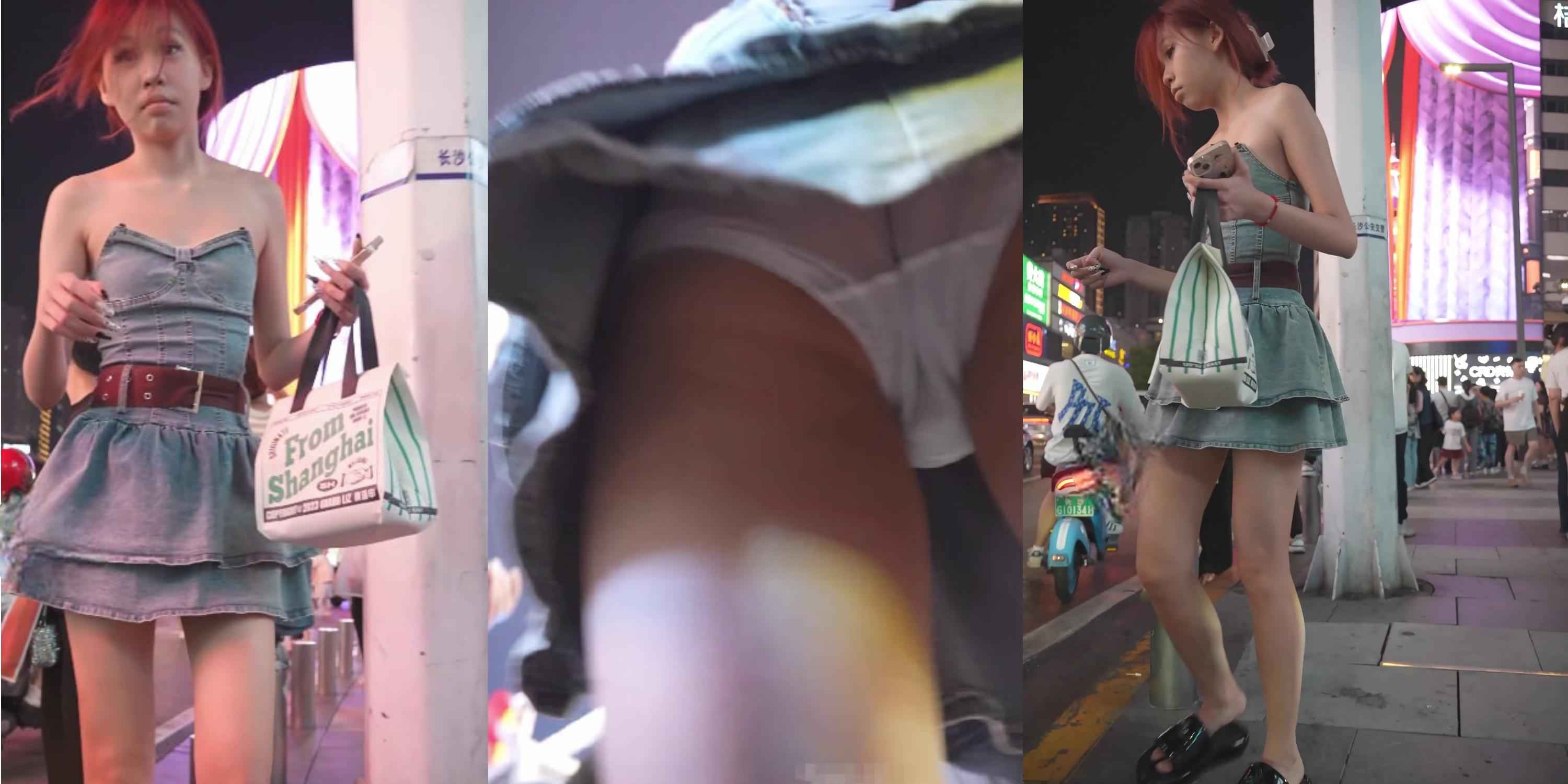 无打底抹胸牛仔裙跟拍,骚内透肉逼痕硬爆