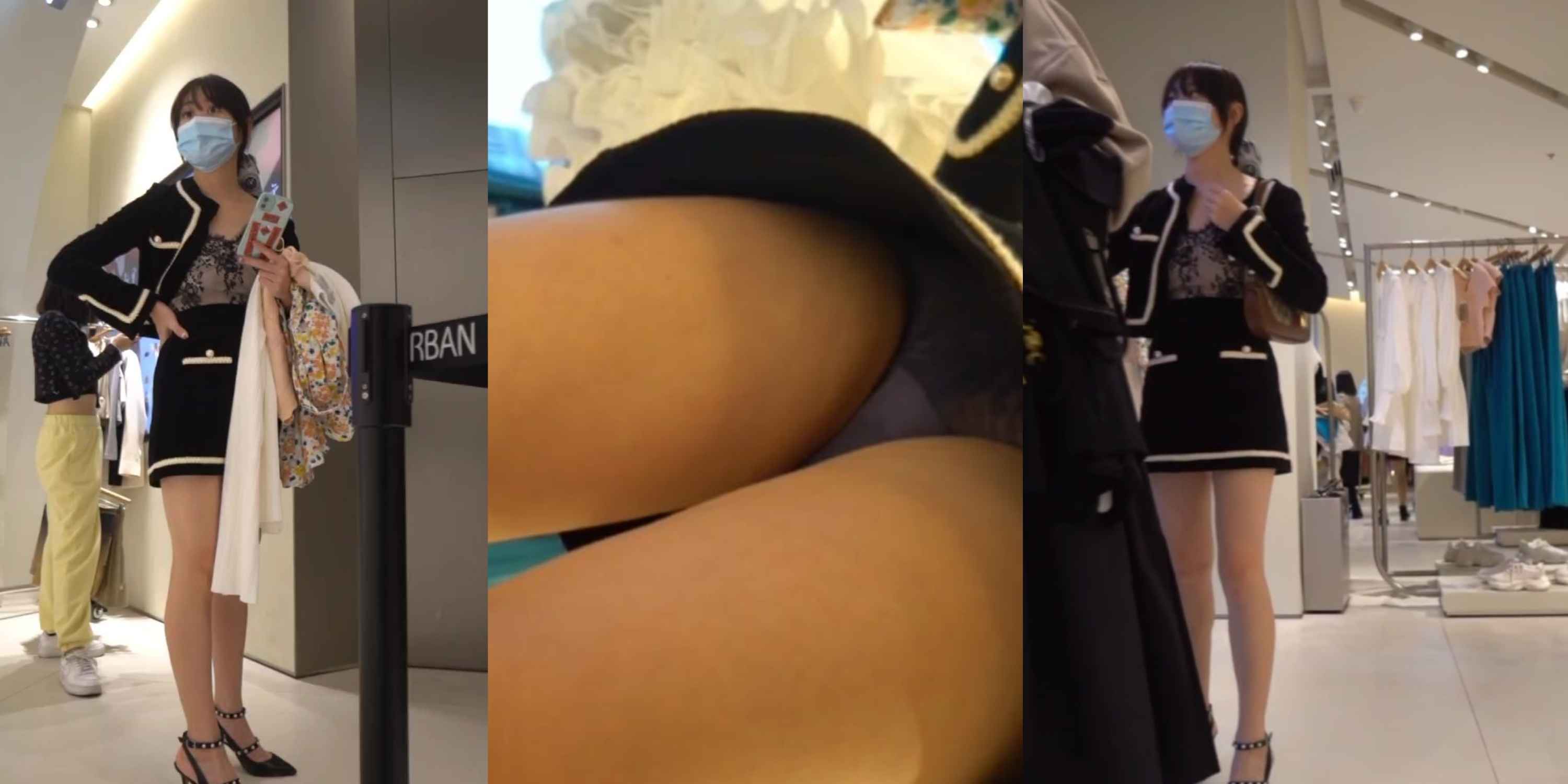 商场服装店偷拍极品美腿女神!超短黑裙前后抄底,紫色透明内裤阴毛清晰可见,腿玩年级别