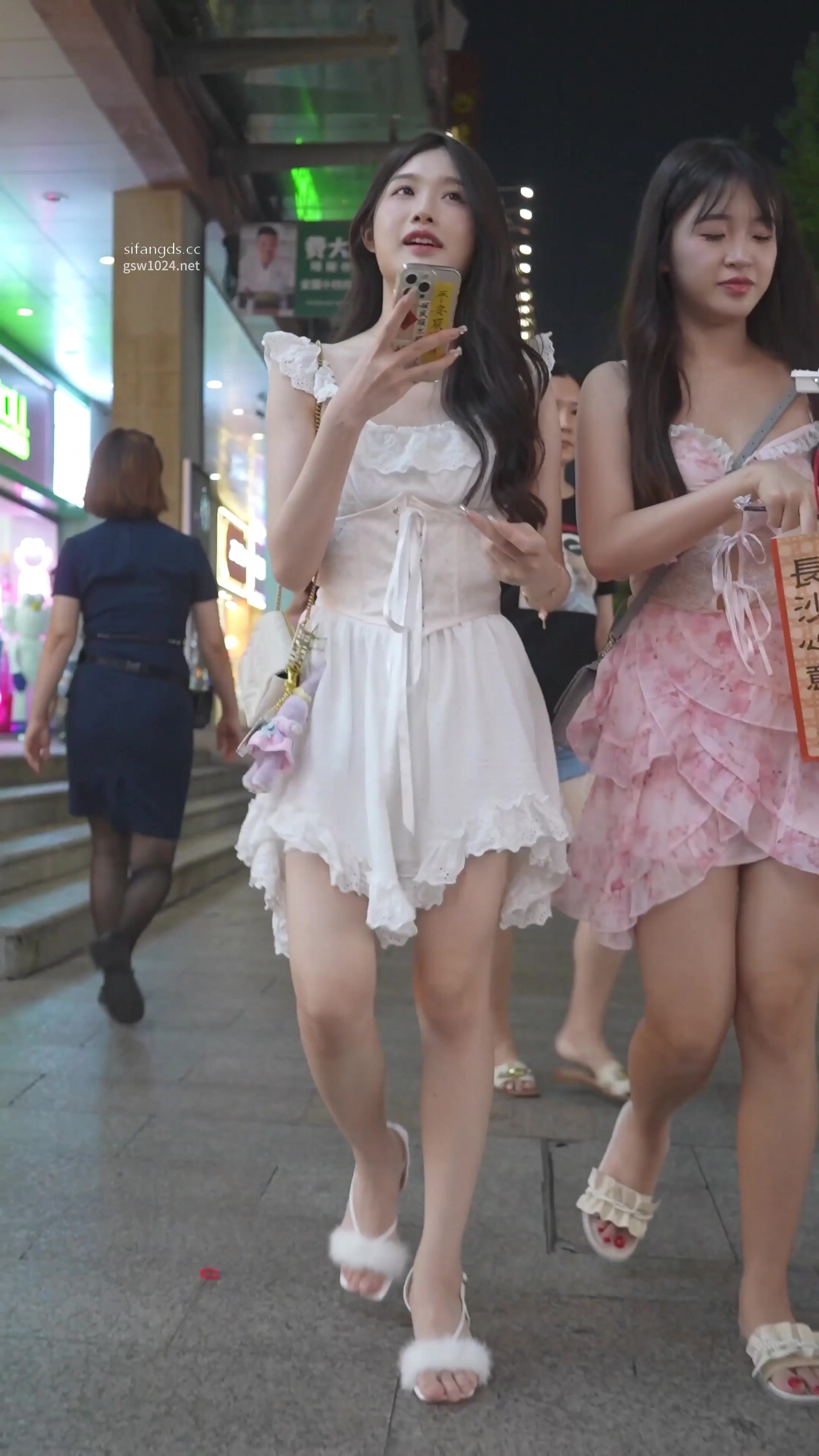 夜市偷拍双生花!粉白蕾丝蓬蓬裙小姐姐裙底白色内裤全露,翘臀腿根春光炸裂