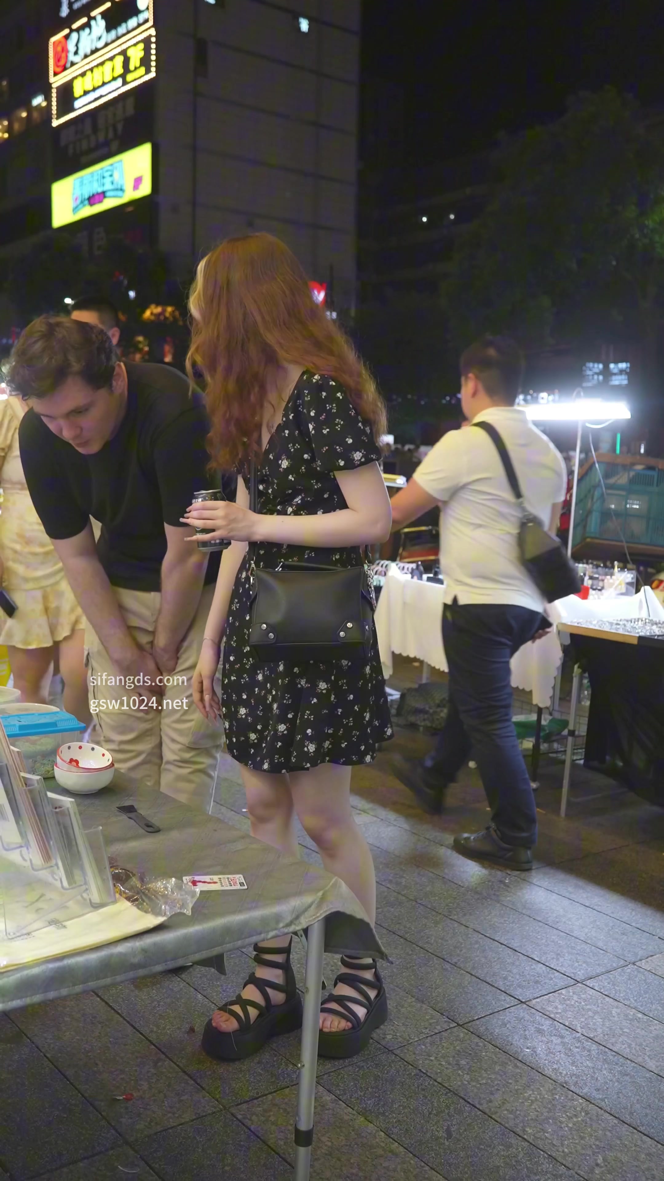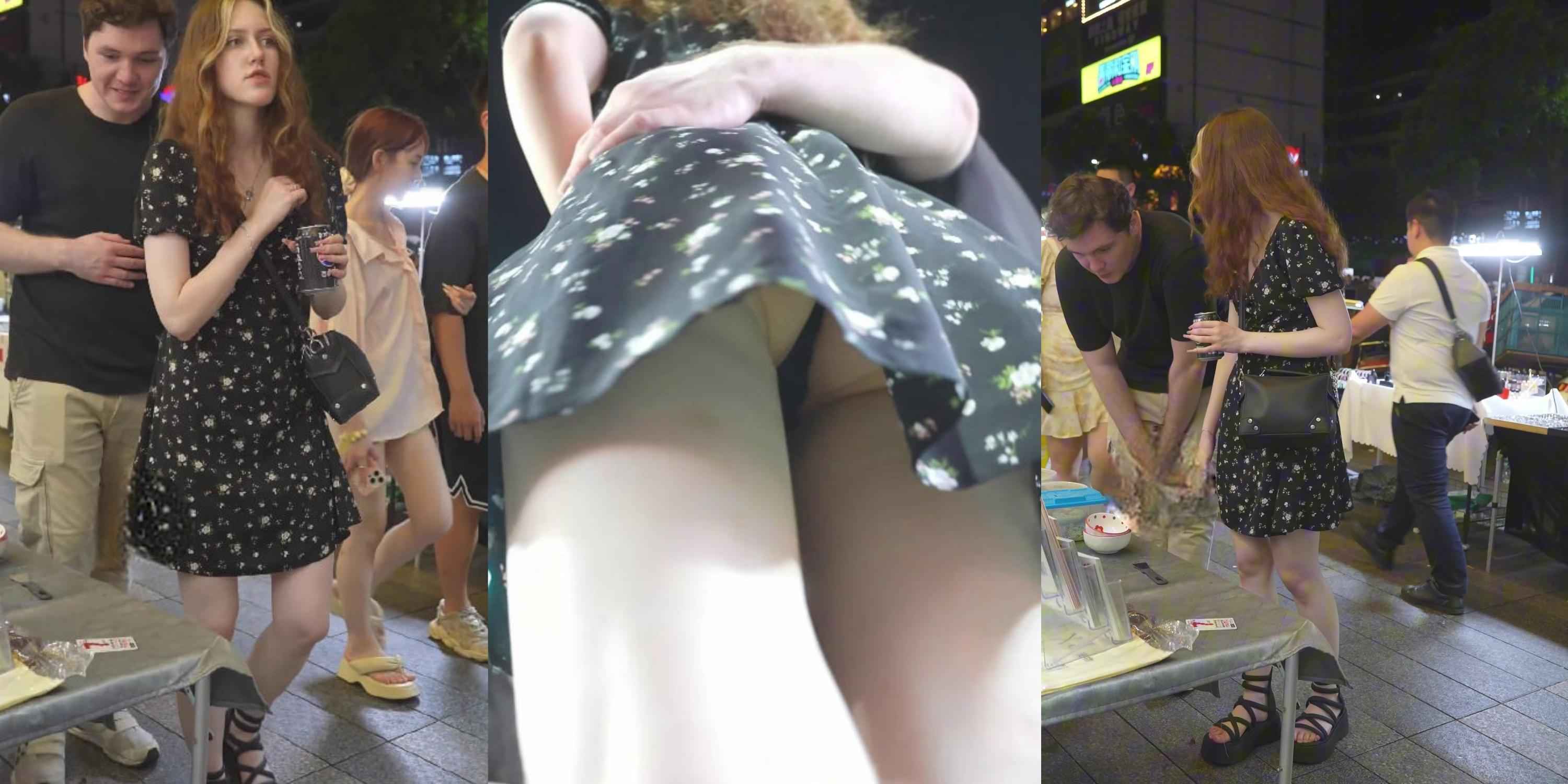 花裙外国小姐姐弯腰翘臀走光,蕾丝丁字裤勒白屁股缝,抄底镜头怼到湿亮!