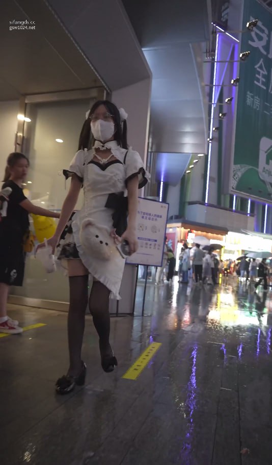 女仆装coser街头偷拍!白色蕾丝蓬蓬裙底黑吊带袜+白色内裤勒进翘臀,腿根肉感春光全漏