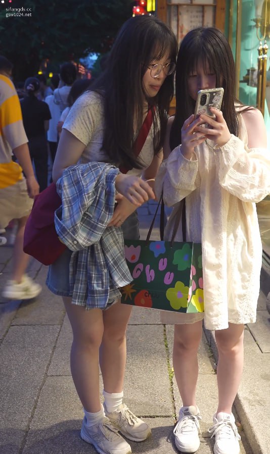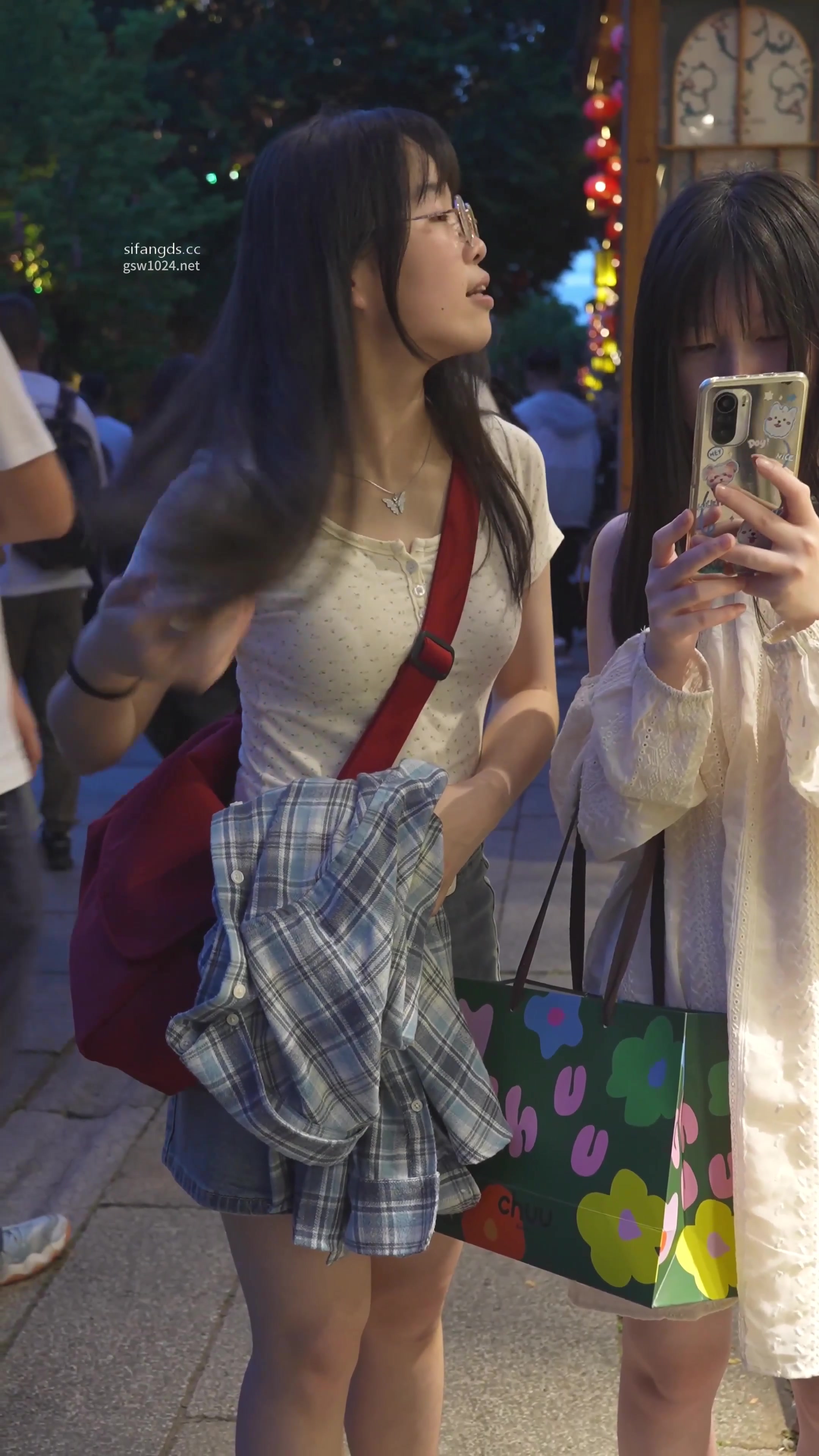 夜市JK双姝低头自拍裙底失守!牛仔超短热裤下白色小内裤全露,翘臀肉缝紧勒看得人当场失控