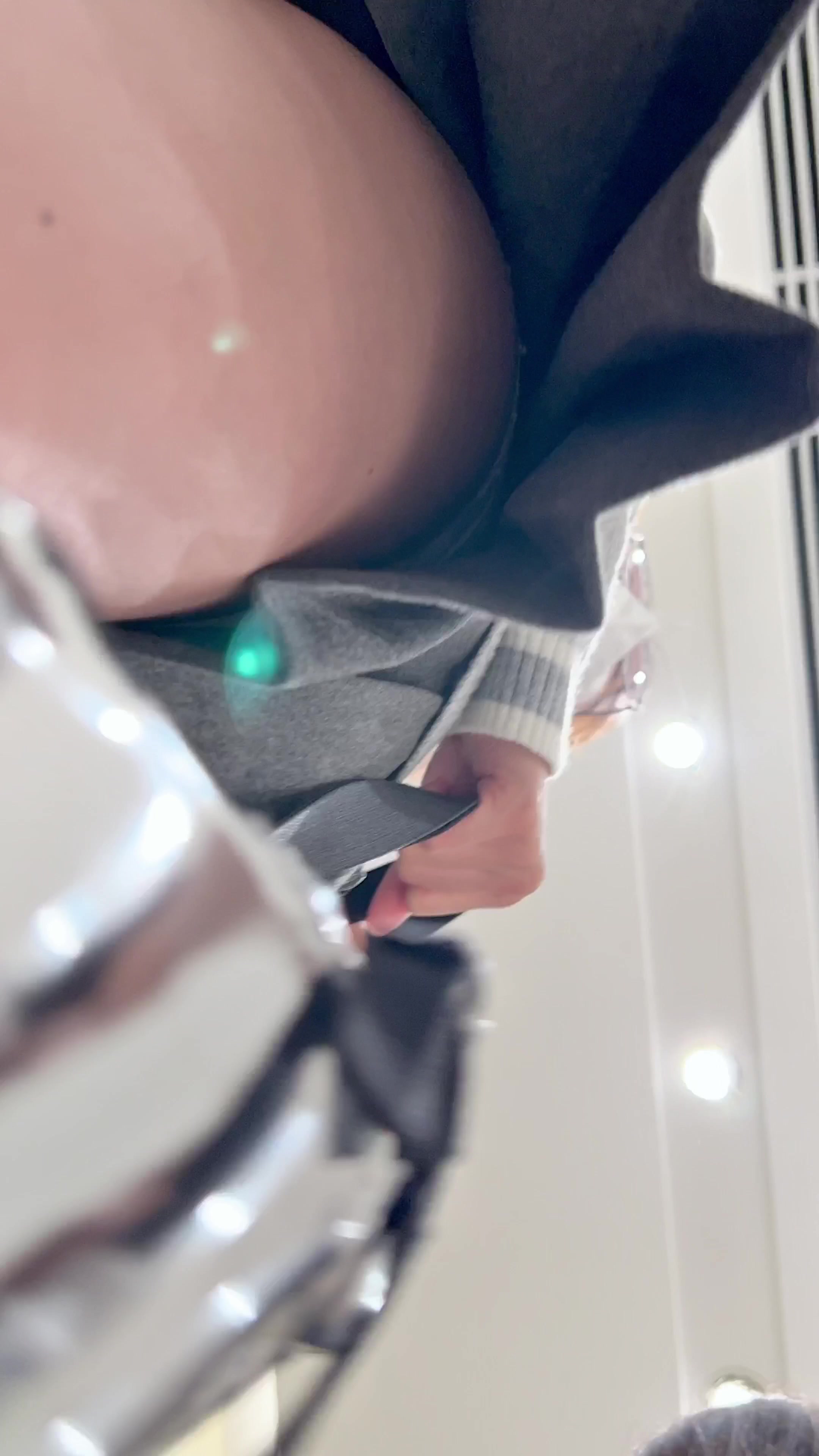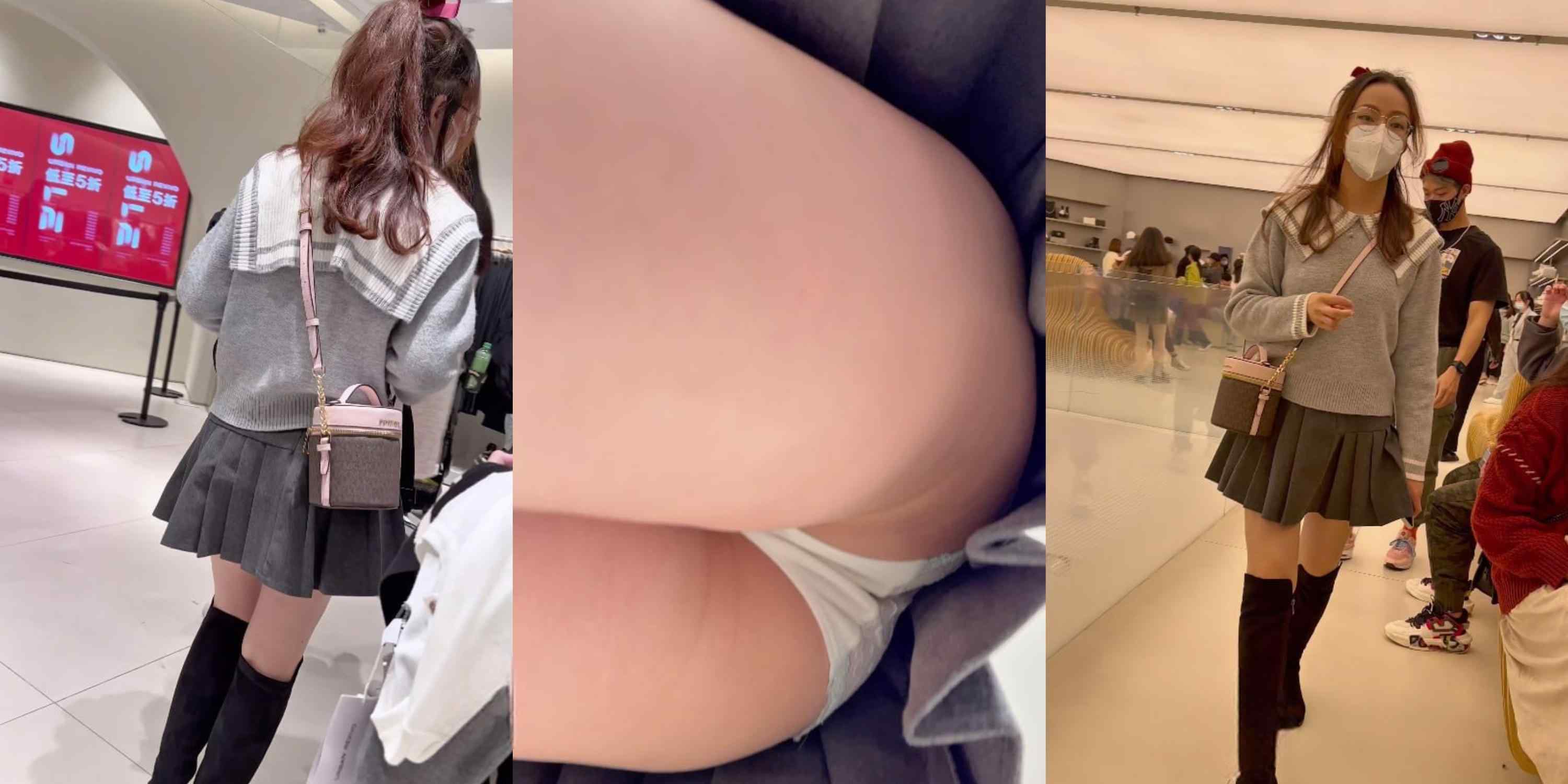商场灰裙JK妹子裙底春光乍现!百褶短裙下白色内裤紧贴臀缝,黑长靴配大腿根风光全露