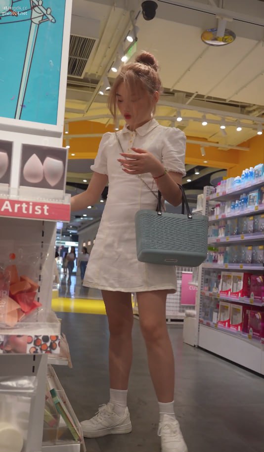商场白裙甜妹低头挑选商品裙底全开!浅绿格子内裤紧贴翘臀肉缝,白袜长腿春光尽露