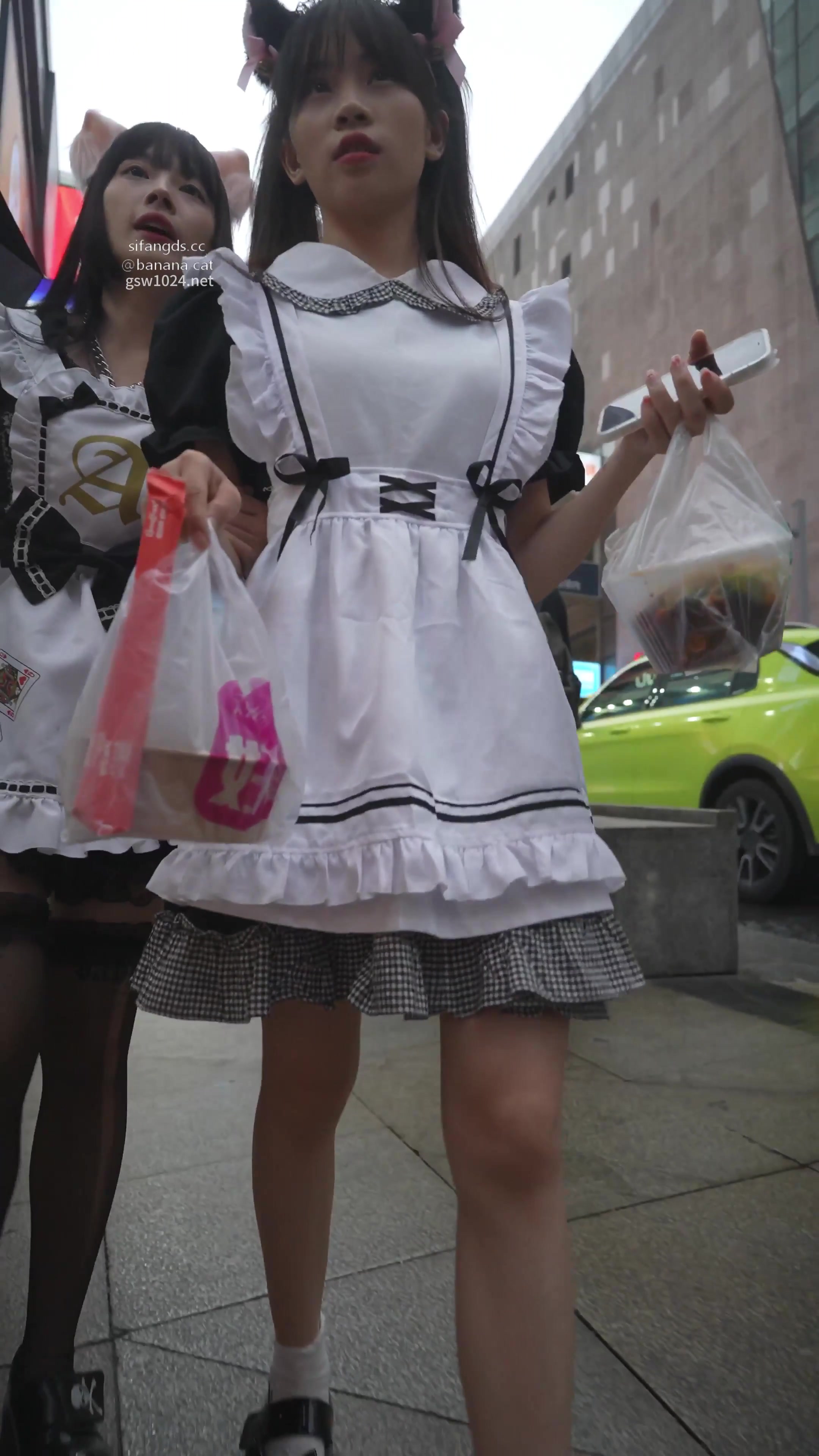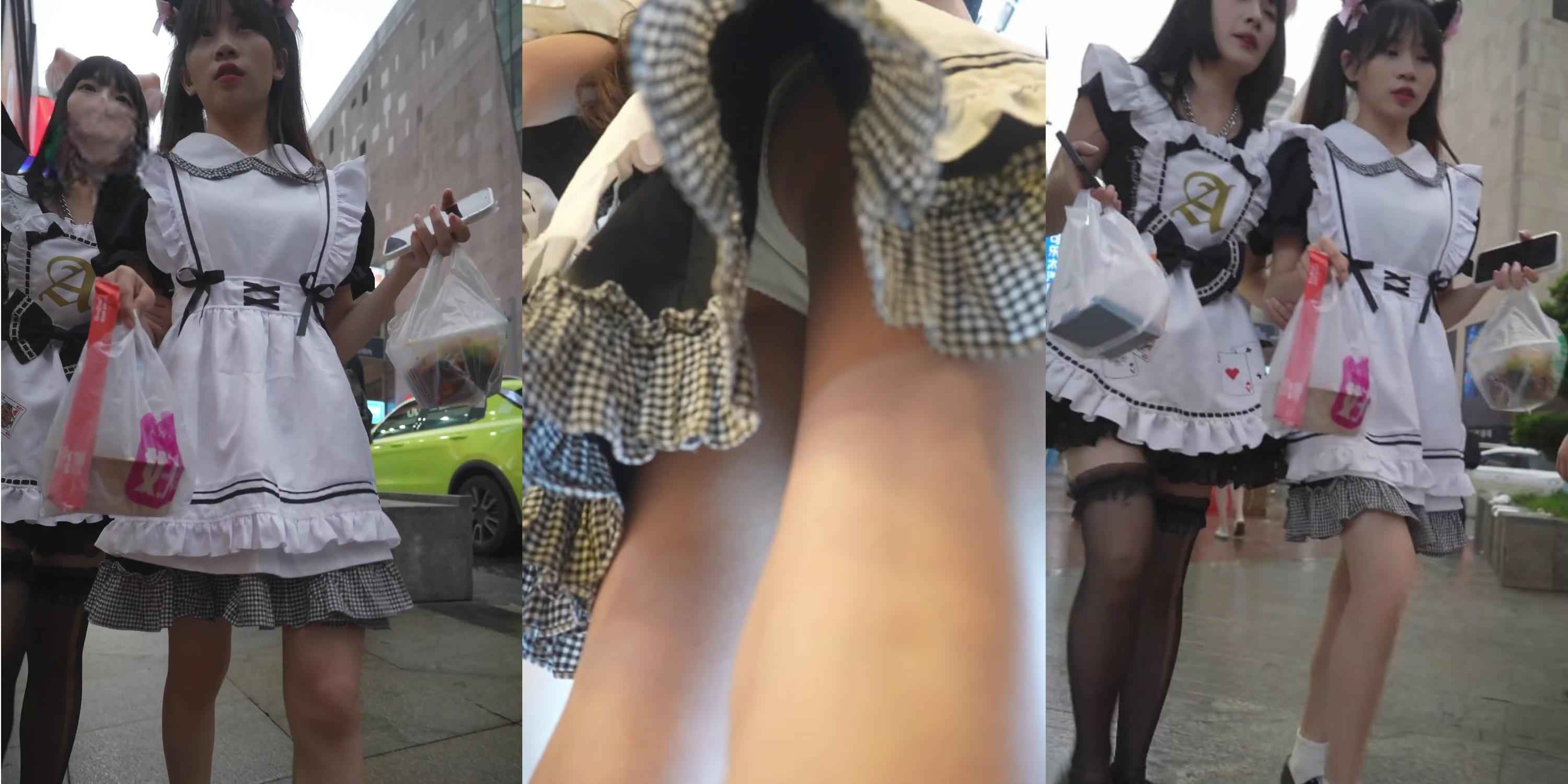 双猫耳女仆小吃街弯腰,黄蕾丝内逼鼓包高清下流!