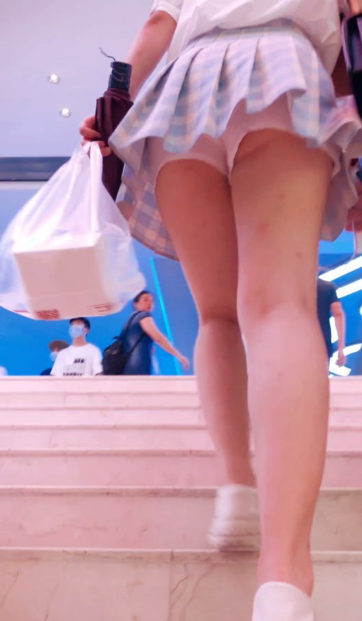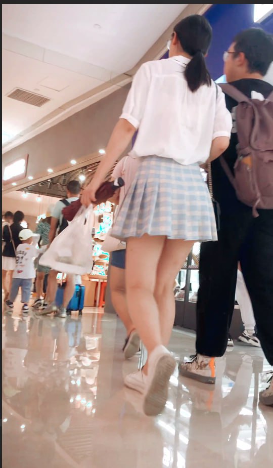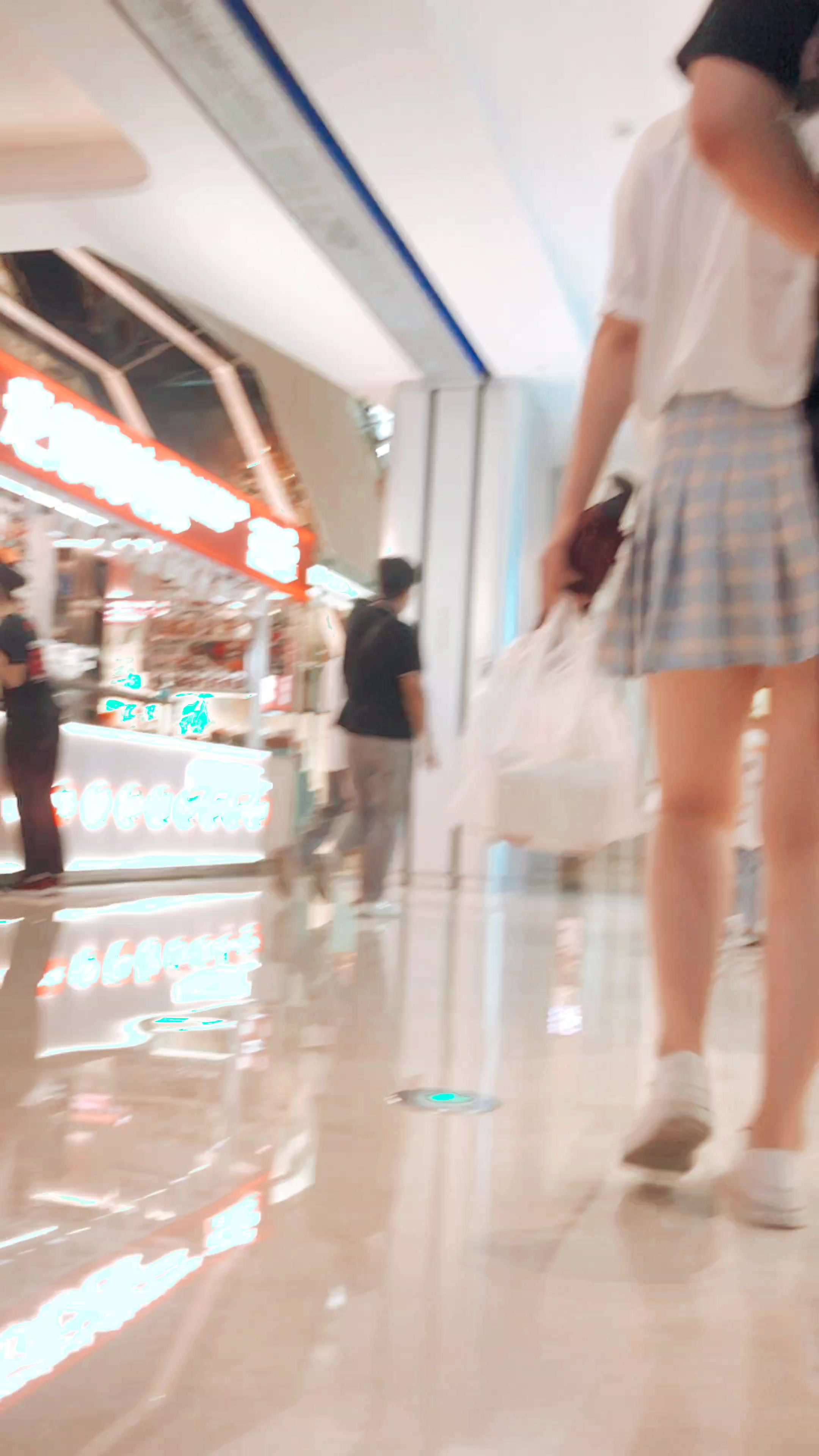 商场格子百褶裙少女走动裙底春光外泄!浅蓝白格短裙下粉色内裤边缘清晰,长腿白袜一步一晃超诱人