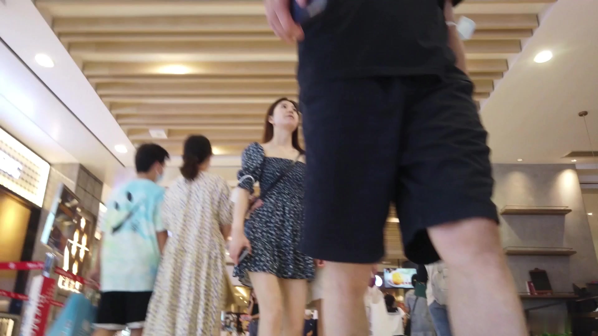 商场连衣裙温柔妹子裙底惊现骚丁!波点蓝裙下黑色丁字裤紧勒翘臀肉缝,温柔外表反差超大尺度