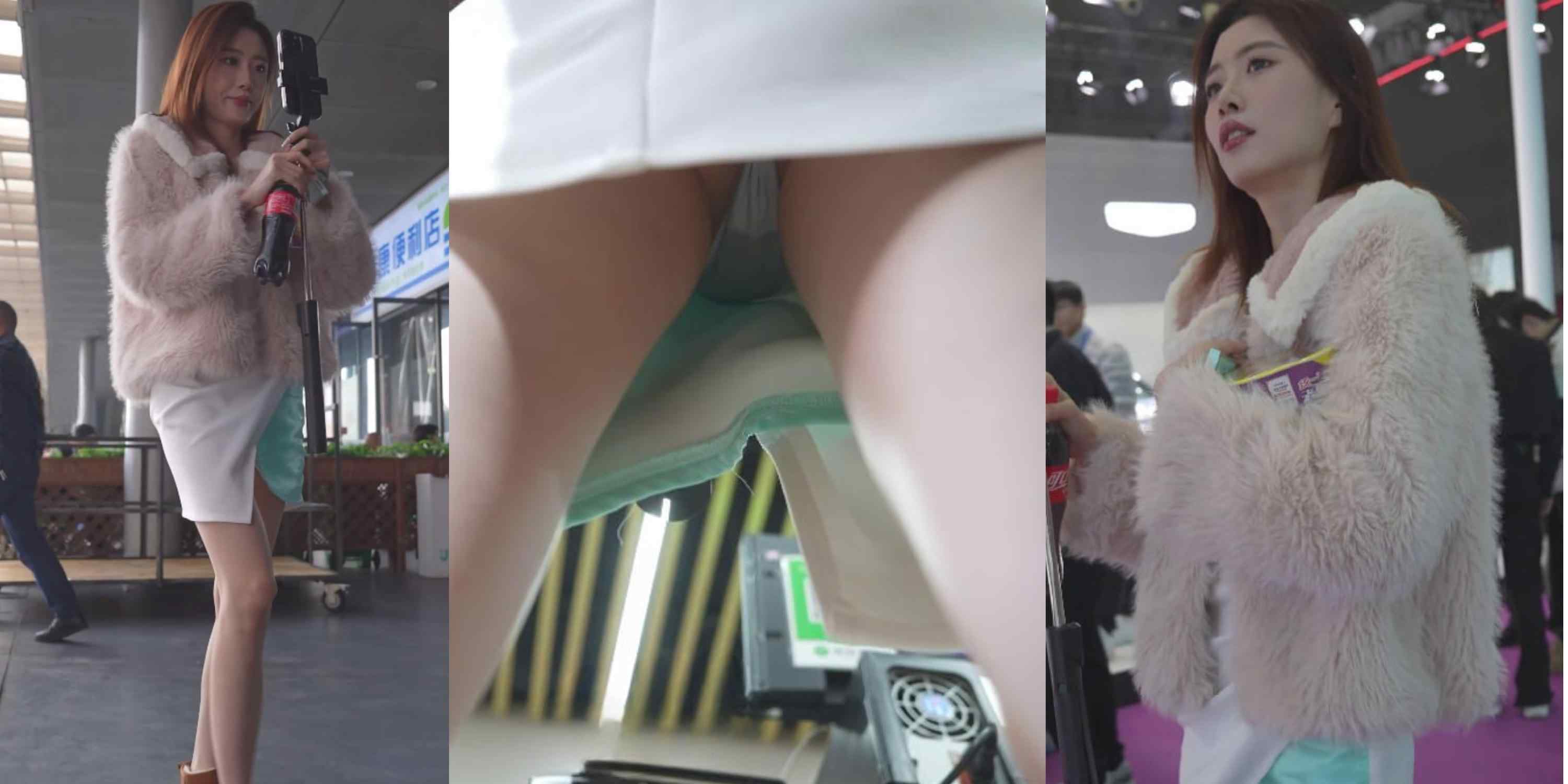 展会便利店抄底长腿车模!微透窄内正面黑逼全露,骚穴轮廓清晰勾人犯罪💦