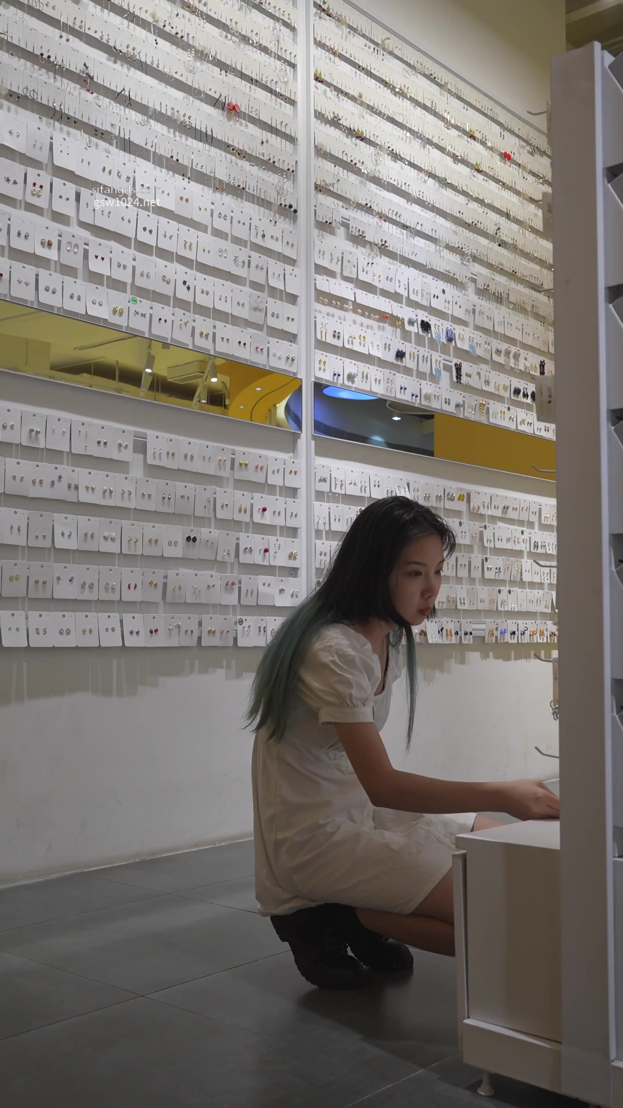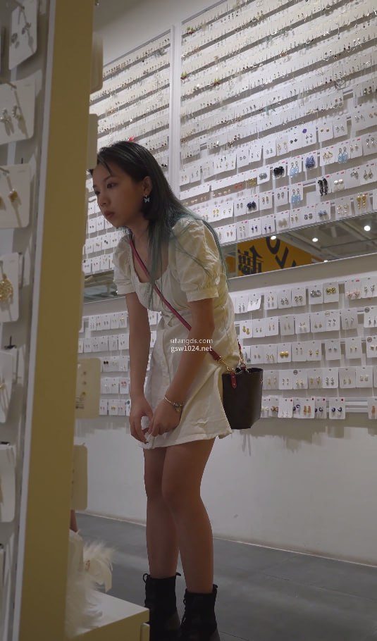 饰品店蓝绿发尾白裙小仙女弯腰挑耳钉裙底失守!浅白棉裙下卡通小内裤紧勒翘臀,圆润肉感大腿根全露超反差