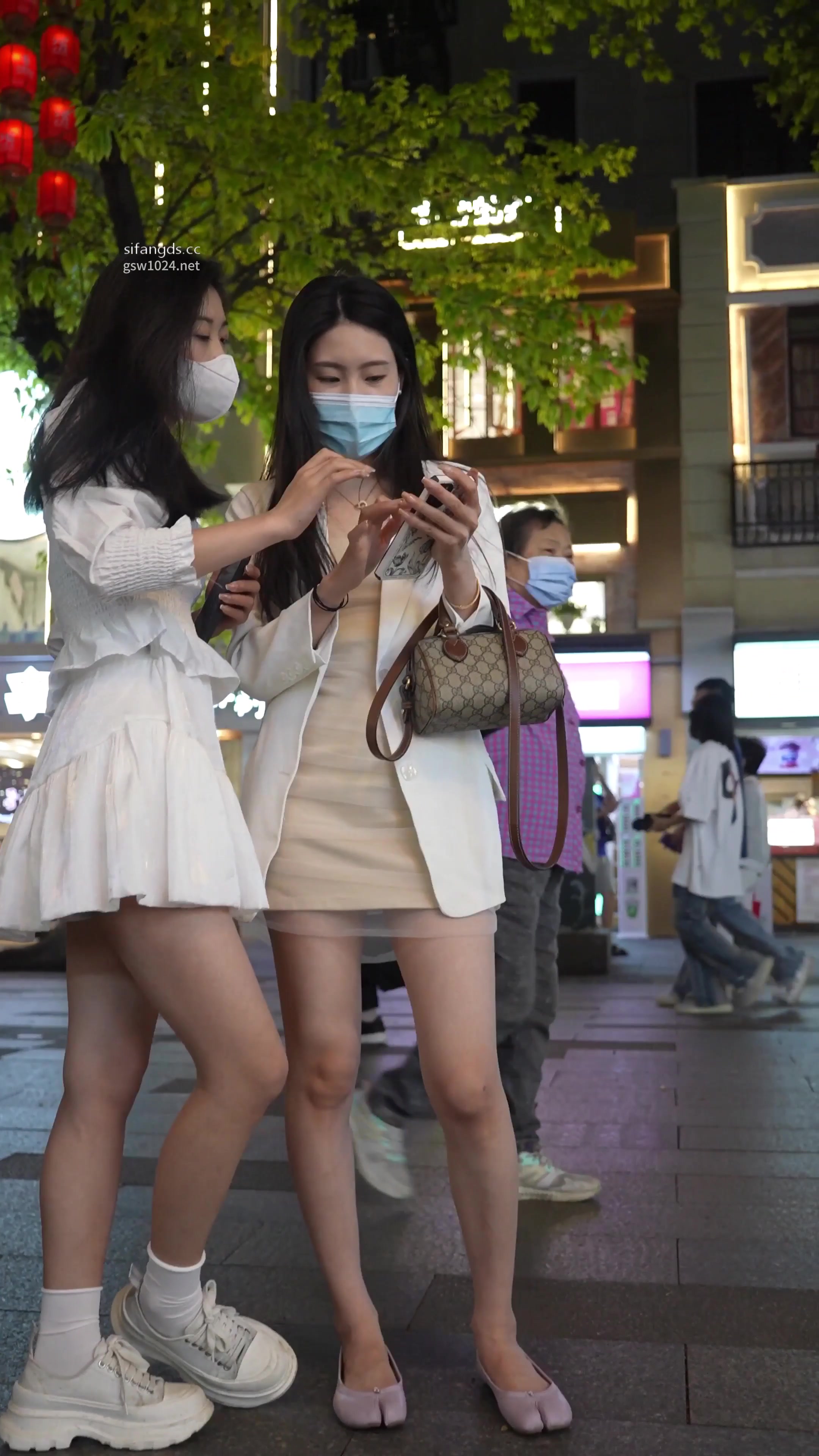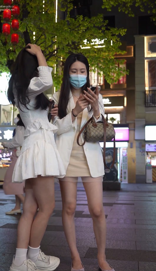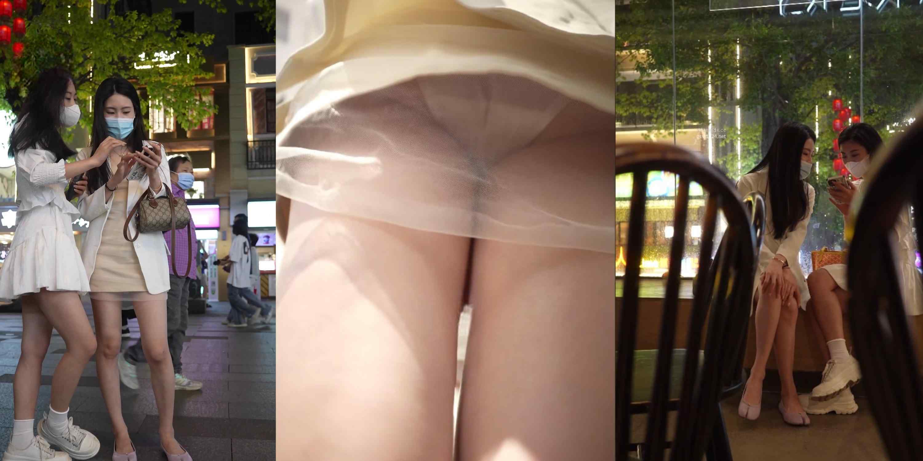 街头白裙双姝自拍裙底春光齐泄!薄纱米白连衣裙下白色小内裤紧勒翘臀,口罩姐妹并肩翘腿坐姿全露大尺度