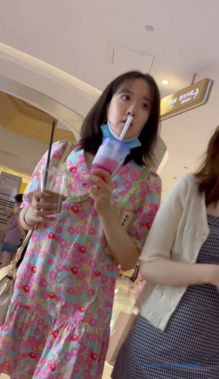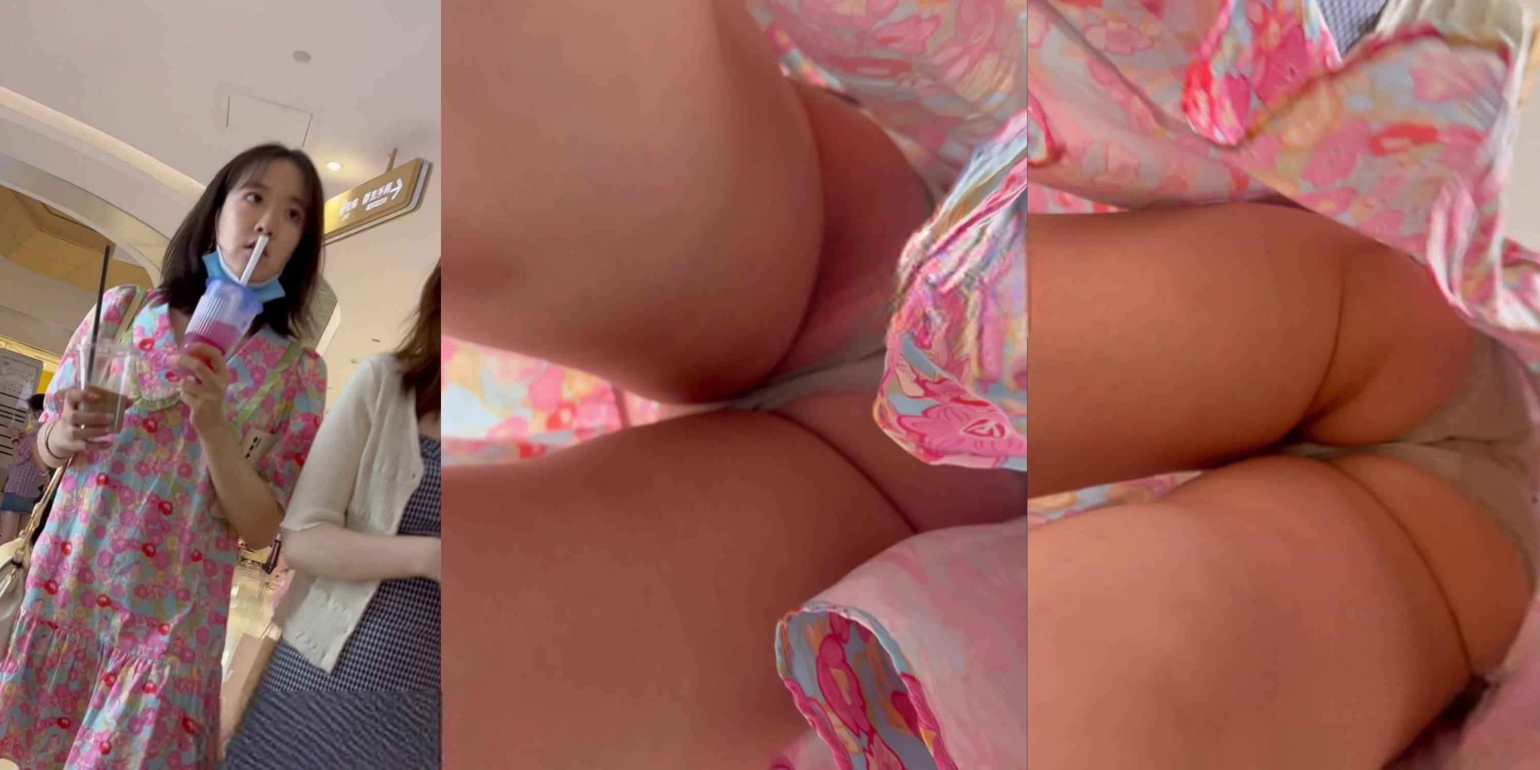 碎花裙靓女翘臀骚窄内全包!粉蓝花裙下粉色窄条内裤紧勒股沟,黑丝大腿根春光前后炸裂