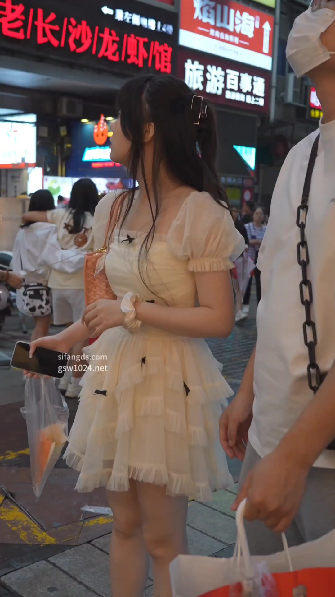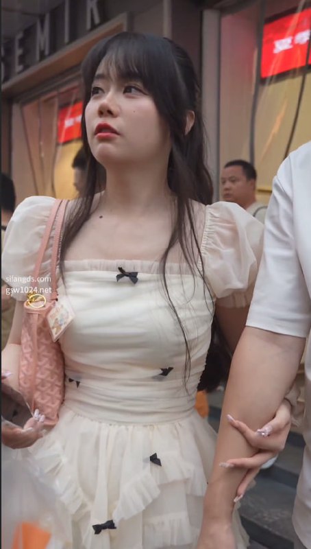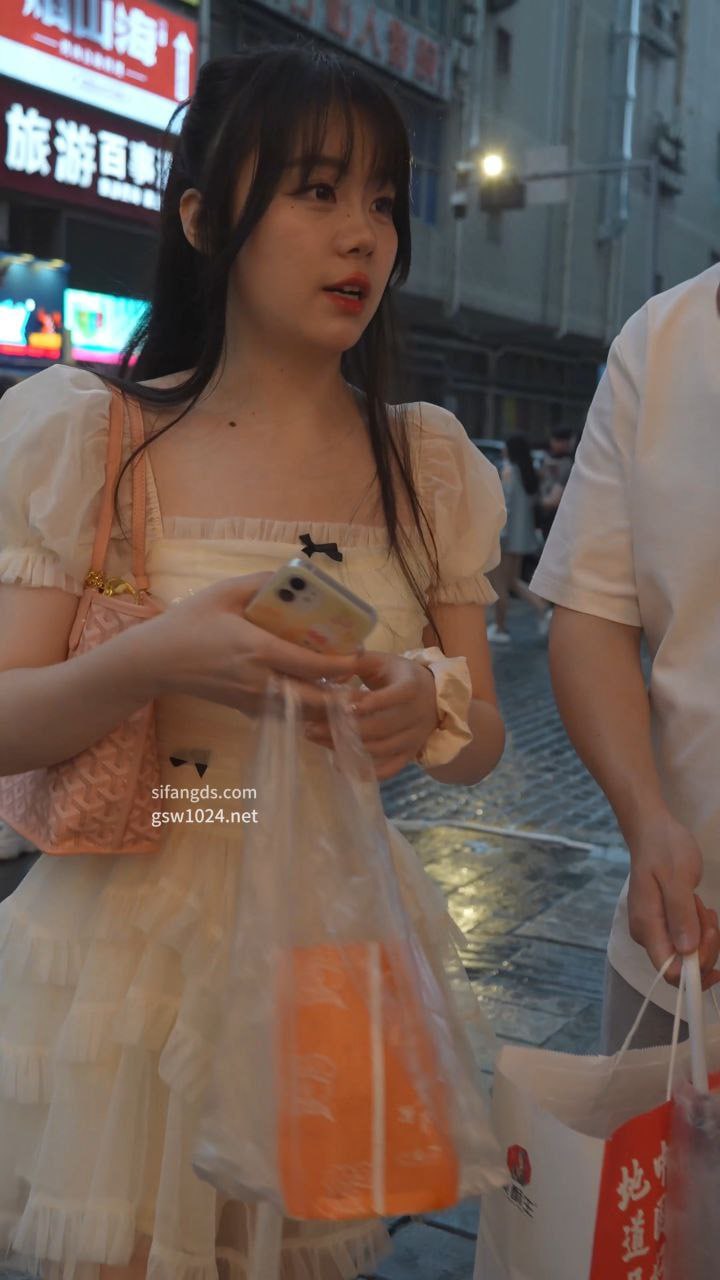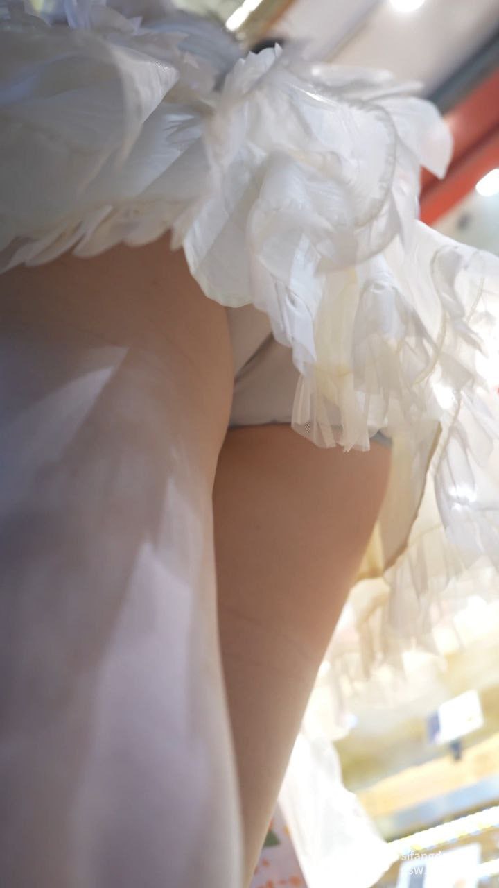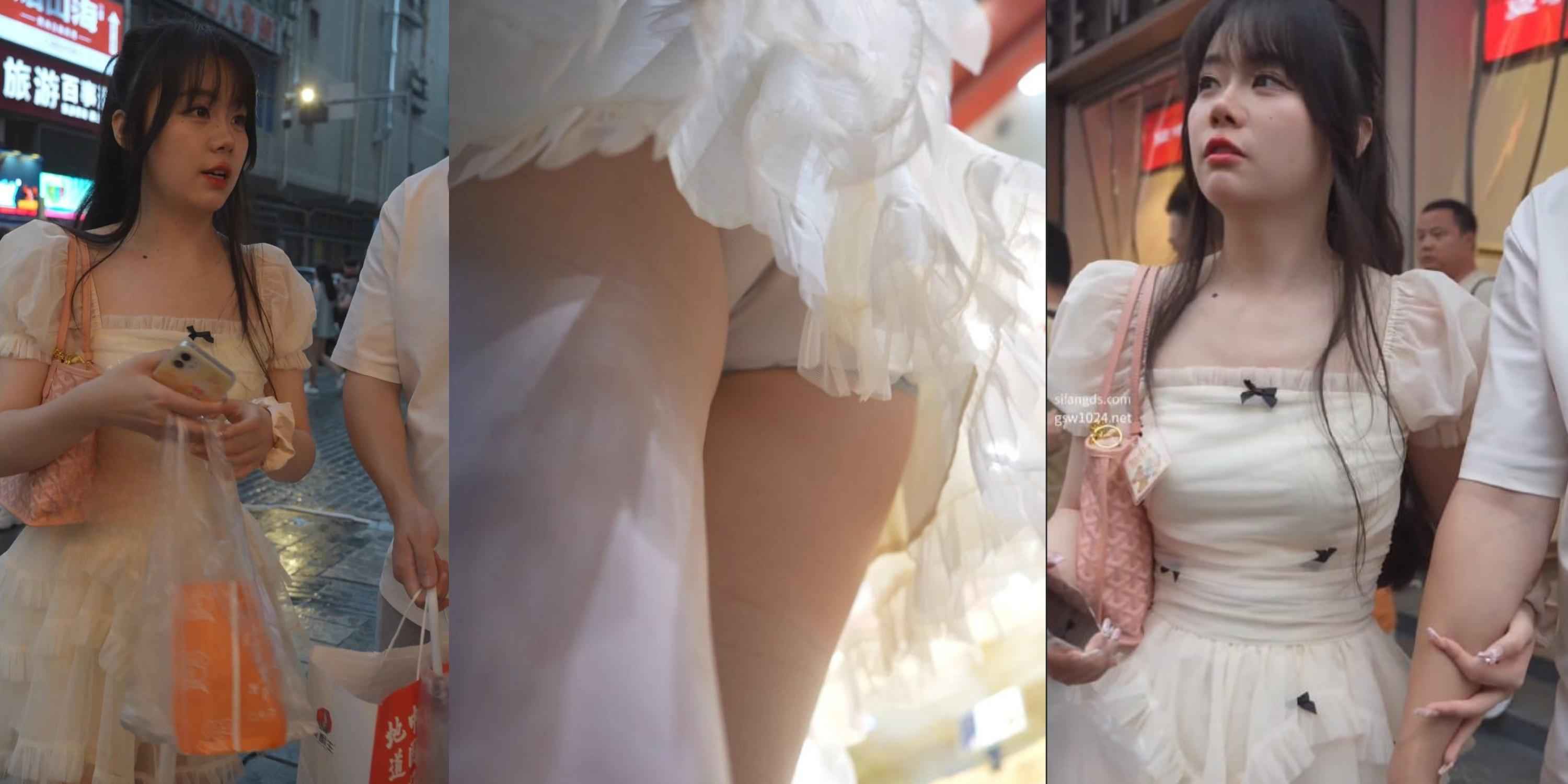 蕾丝公主裙美女逛街浅黄内全露!层层粉白蓬蓬裙下浅黄小内裤紧勒翘臀,清凉高跟贴脸低角度春光炸裂
