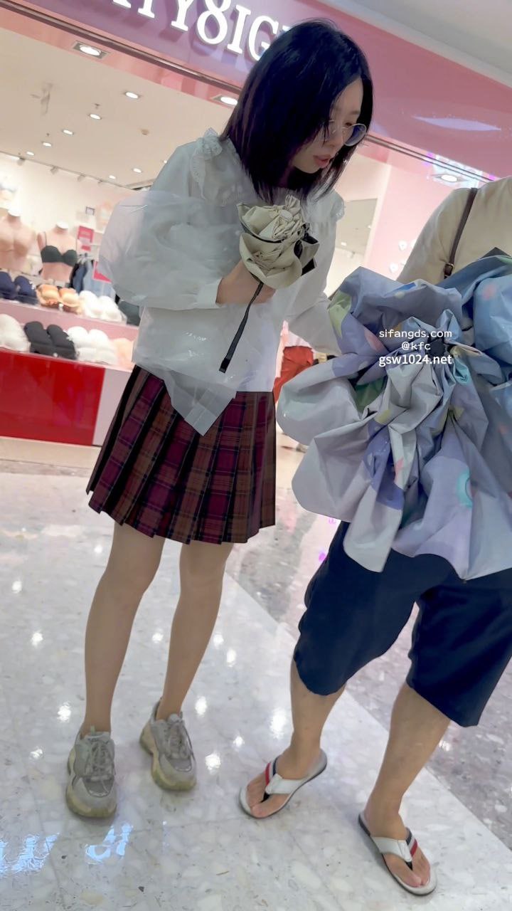 制服JK学生妹和男友逛街,肉色丝袜下紫色可爱内裤前后显露