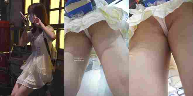 小学妹逛街蕾丝裙摇臀,粉色窄内前后勒出骚臀形状