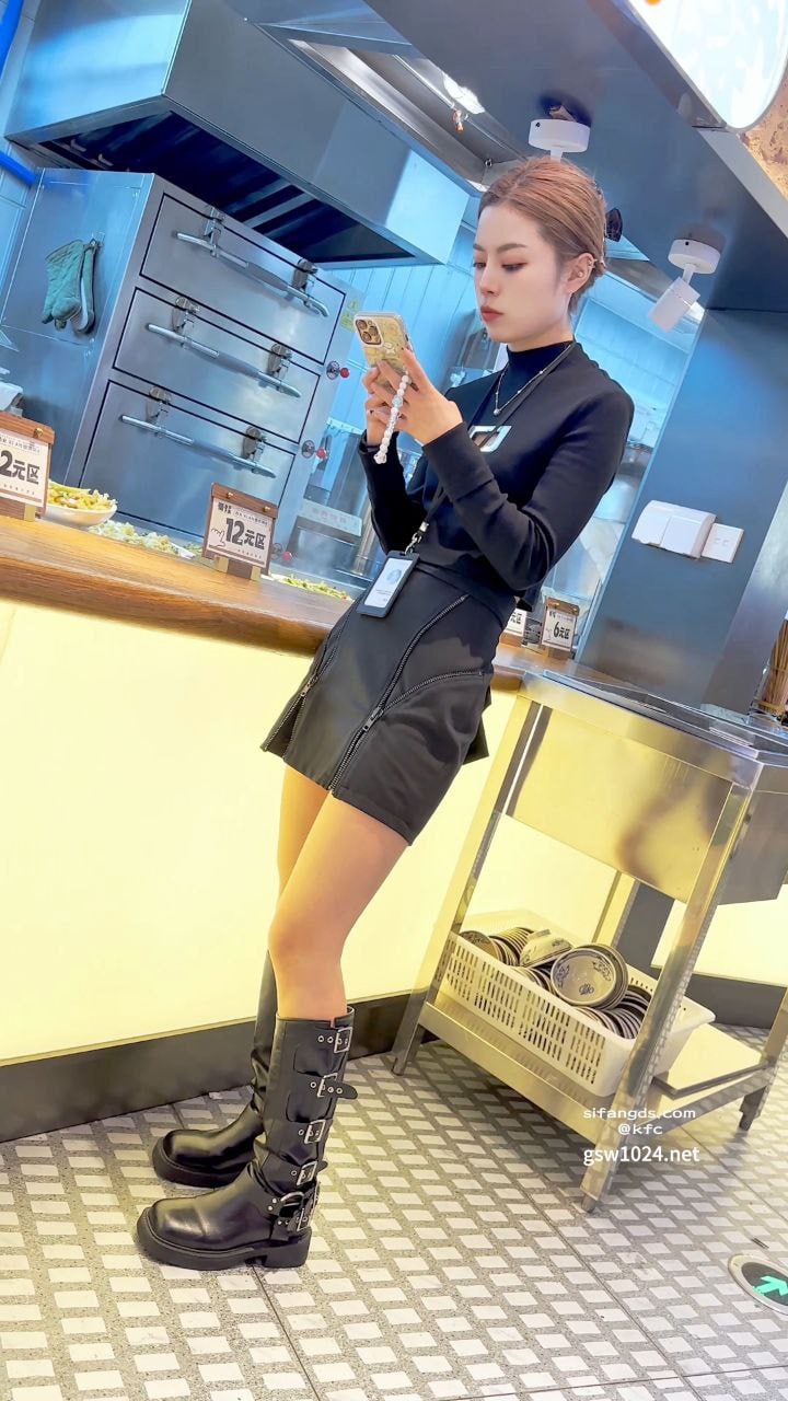 服装店员下班去打包吃的,弯腰翘臀被低角度抄底白色内裤全露