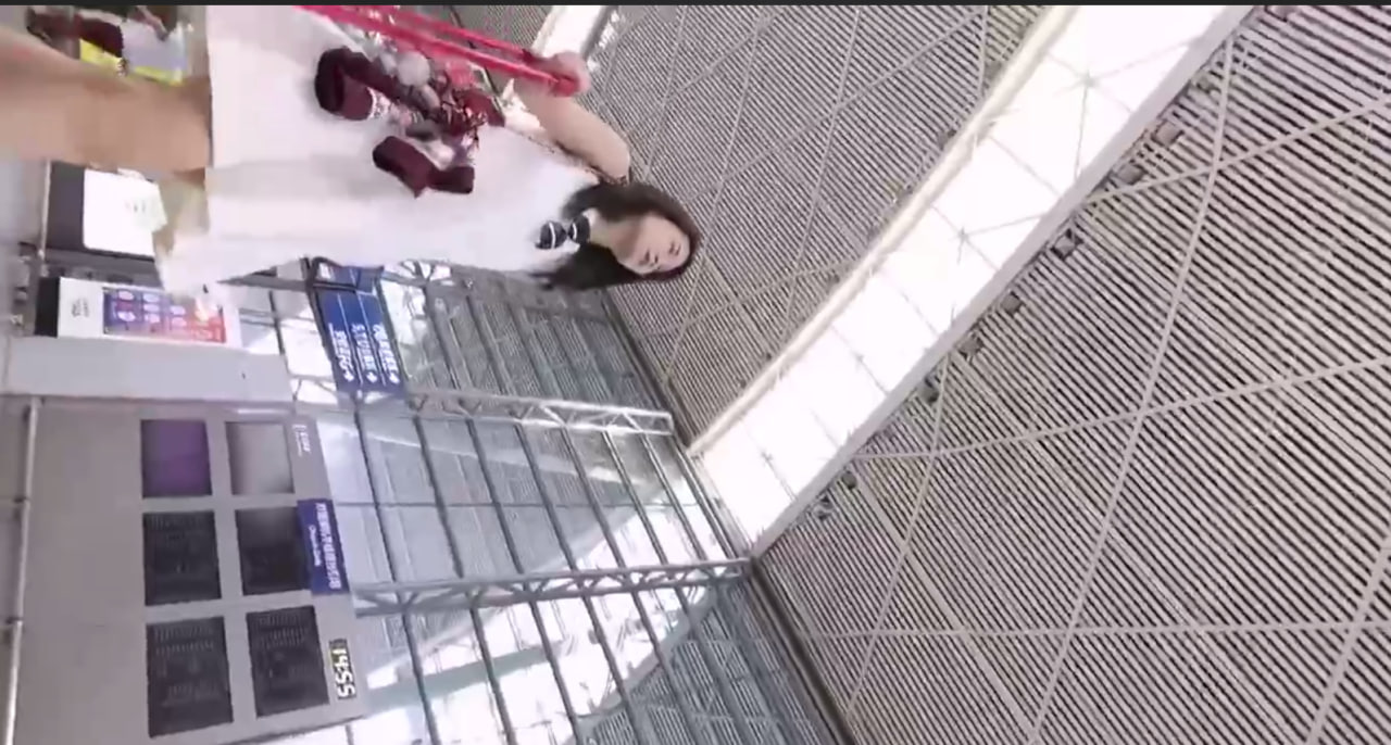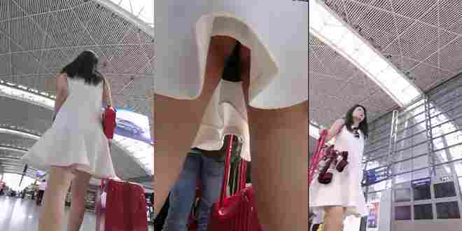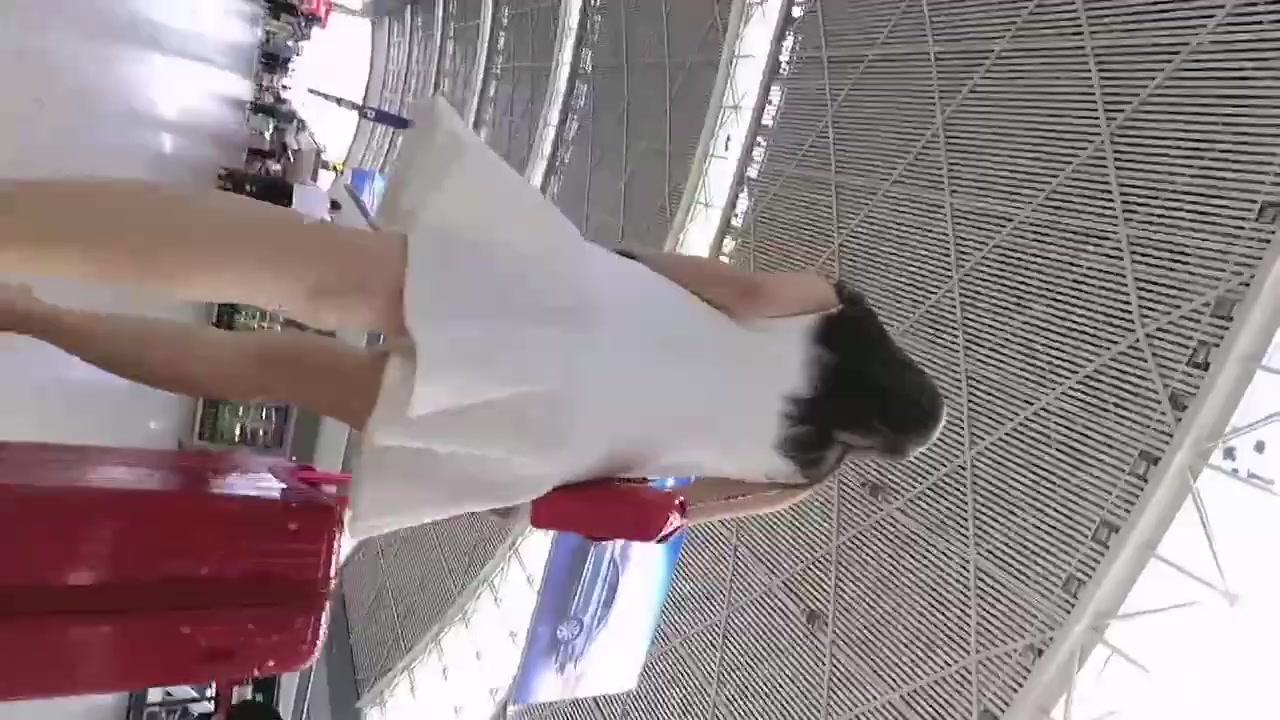 机场美女行李箱前弯腰,黑丁字裤细绳勒紧,逼毛外露全被抄底