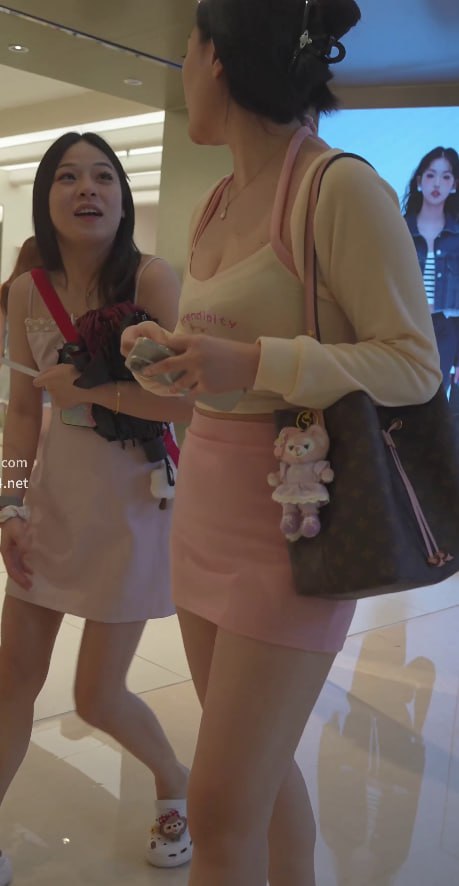 露背吊带裙小姐姐低角度前后抄底!微透白内屁股缝全露