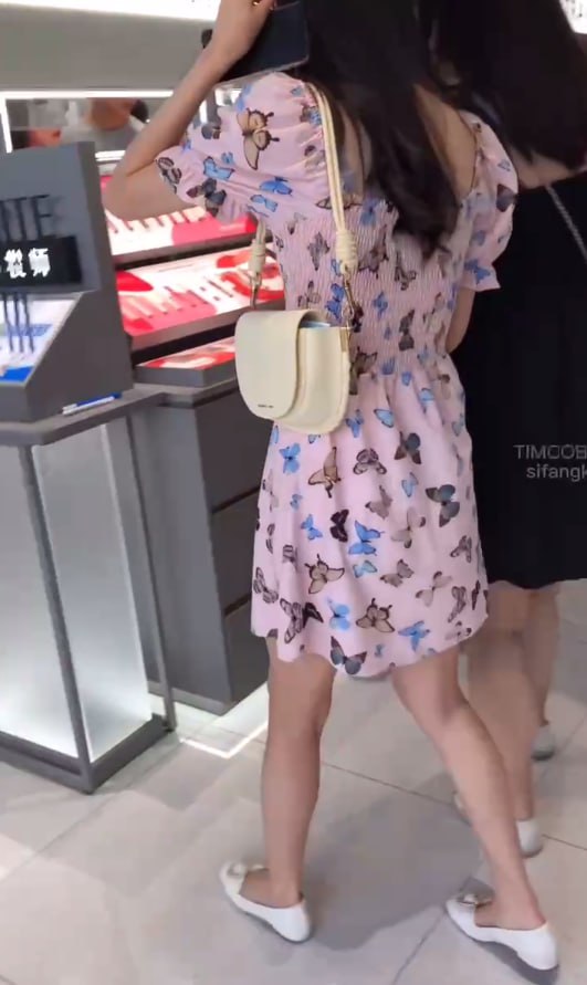 可爱蝴蝶粉裙美女逛街抄底!白色蕾丝内裤勒进翘臀,腿根春光全露太诱人