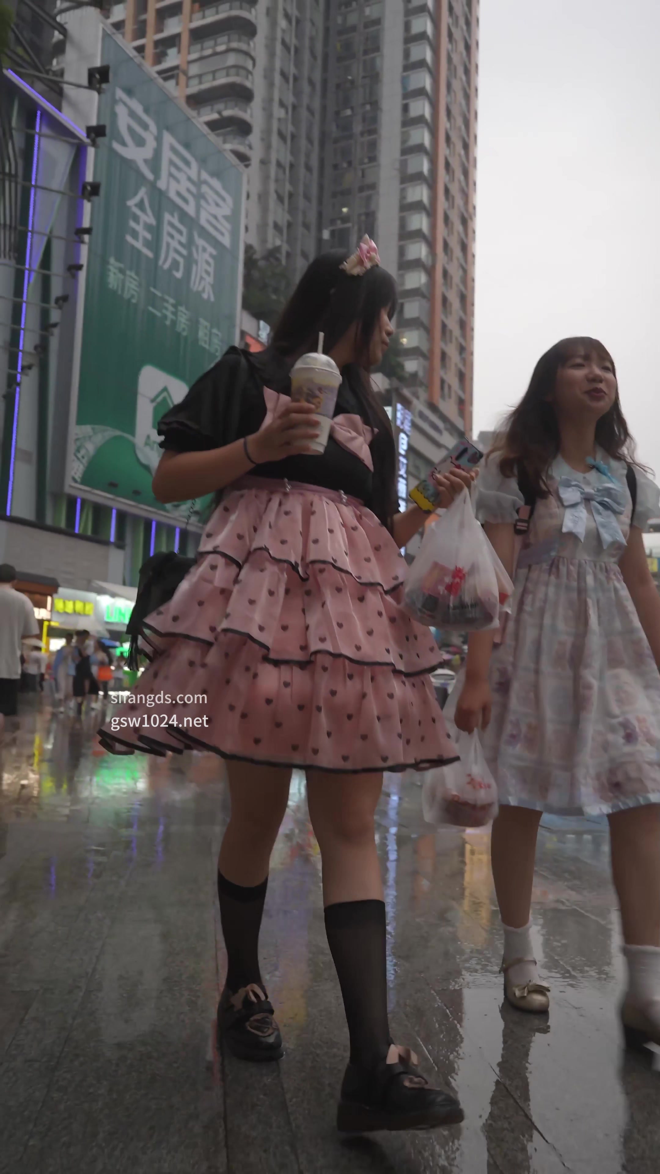 抄底天菜!粉色lo裙美女小吃街,透气内正面露黑春光
