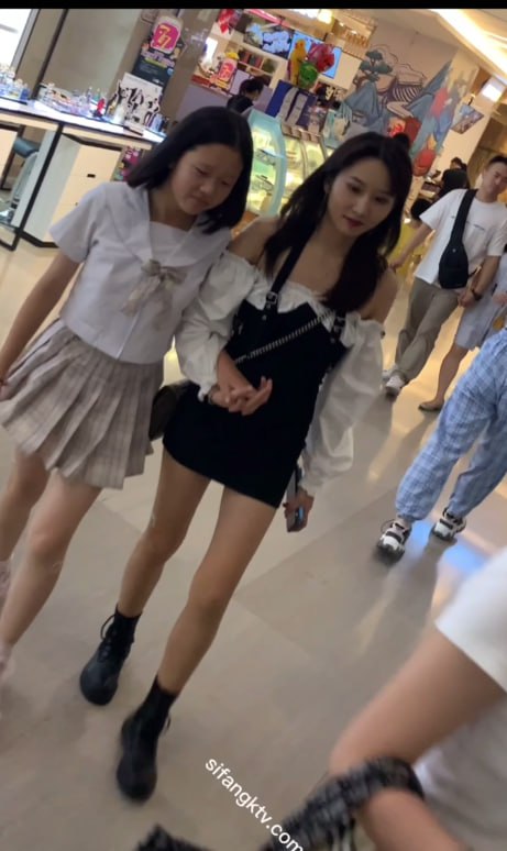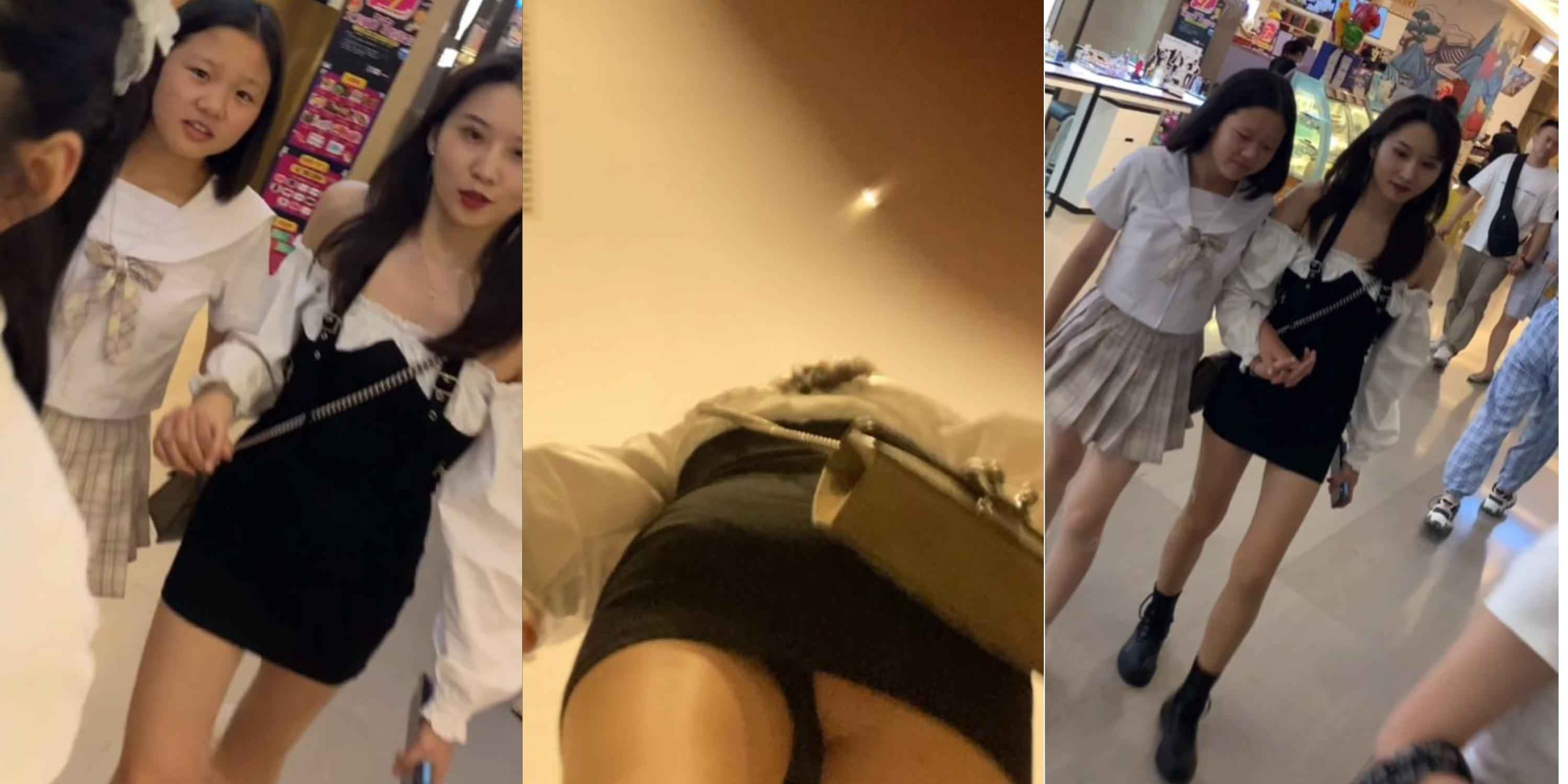 商场黑吊带短裙高颜值美女,弯腰瞬间黑丁字裤细绳勒进肥臀被低角度抄底全露