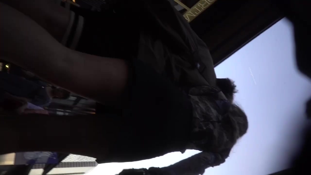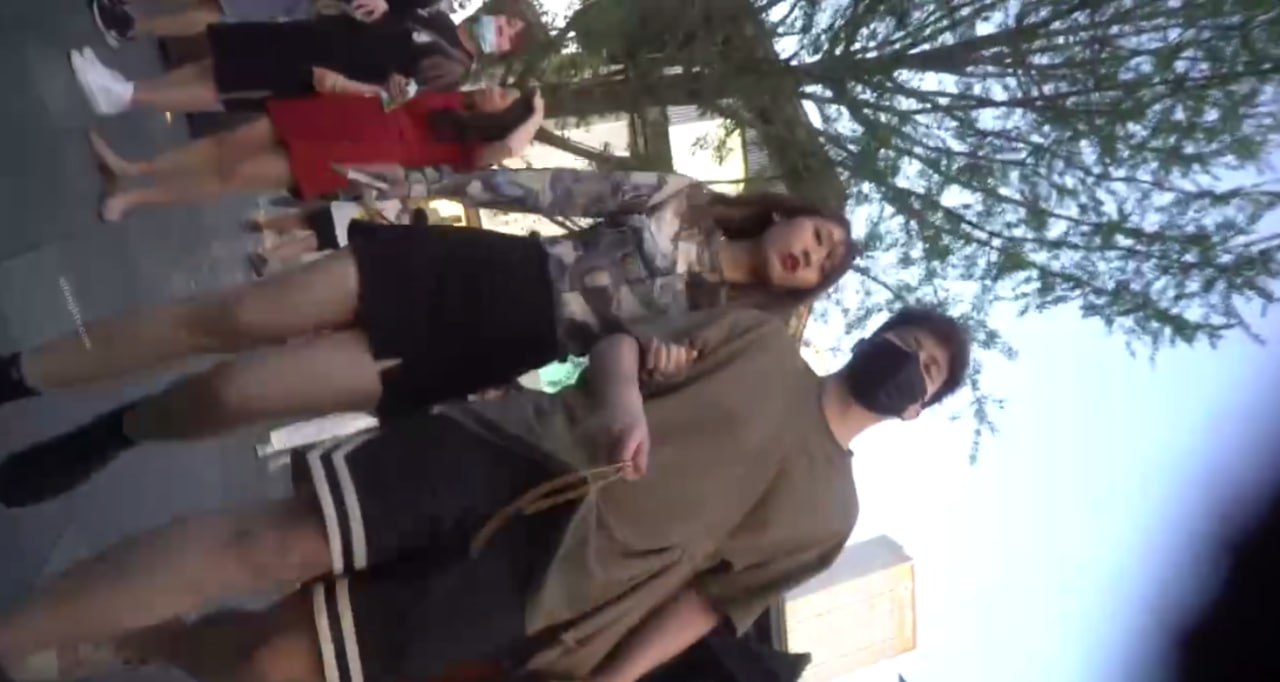 街头黑色短裙美女并肩同行,裙底内裤紧贴翘臀被低角度抄底全露