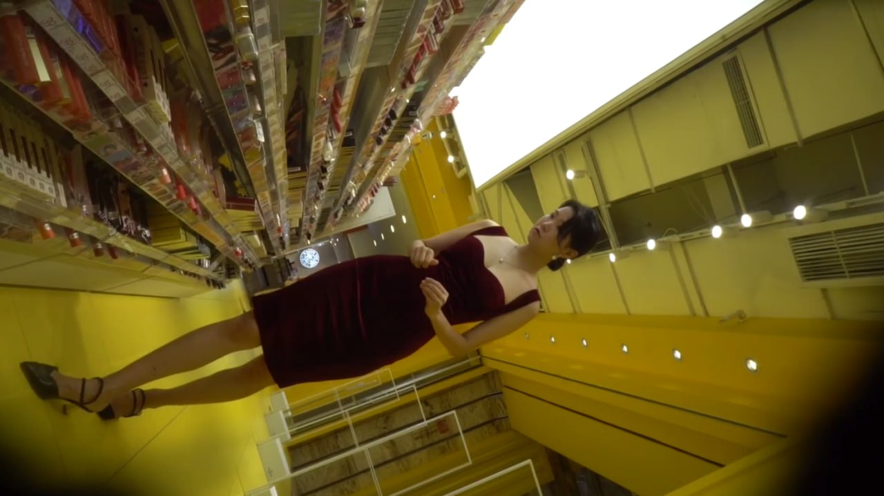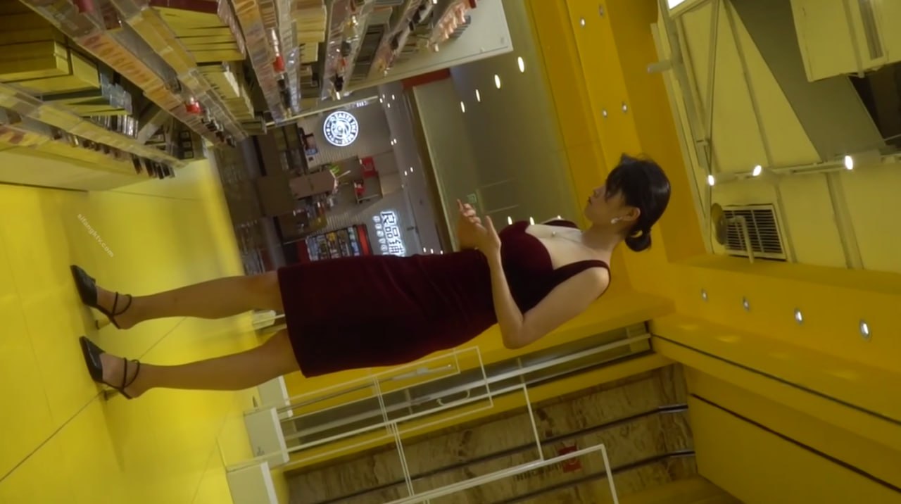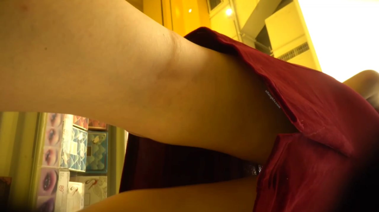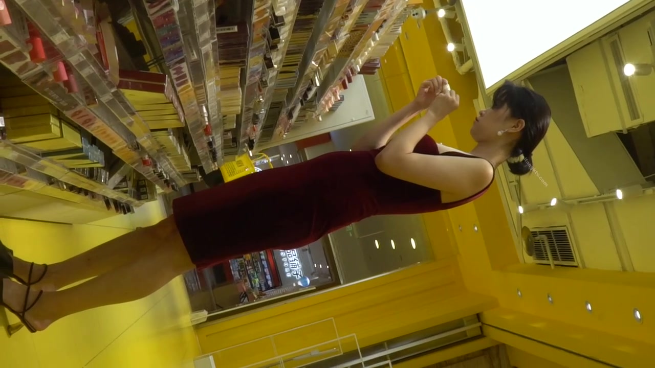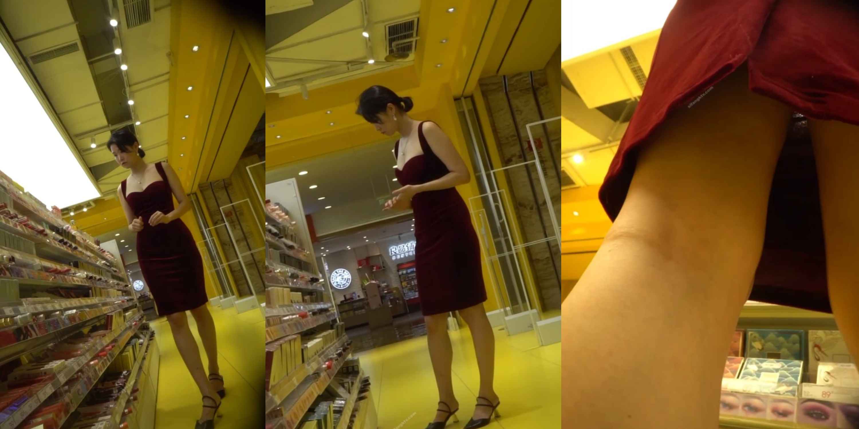 商场酒红色丝绒包臀裙美女弯腰挑货,裙底内裤紧勒翘臀被低角度抄底全露