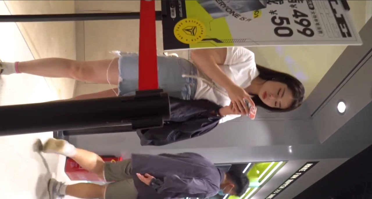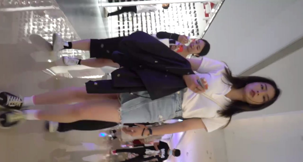 商场牛仔短裙少女低头购物,黑丝+白色内裤紧勒翘臀被低角度抄底全露