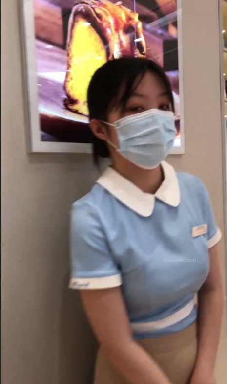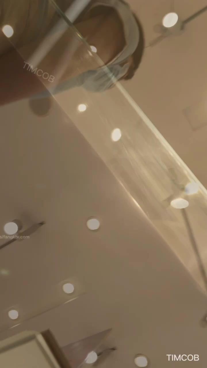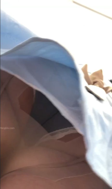 零食店蓝白制服店员,超短裙下肉丝+白色内裤紧勒翘臀被低角度抄底全露