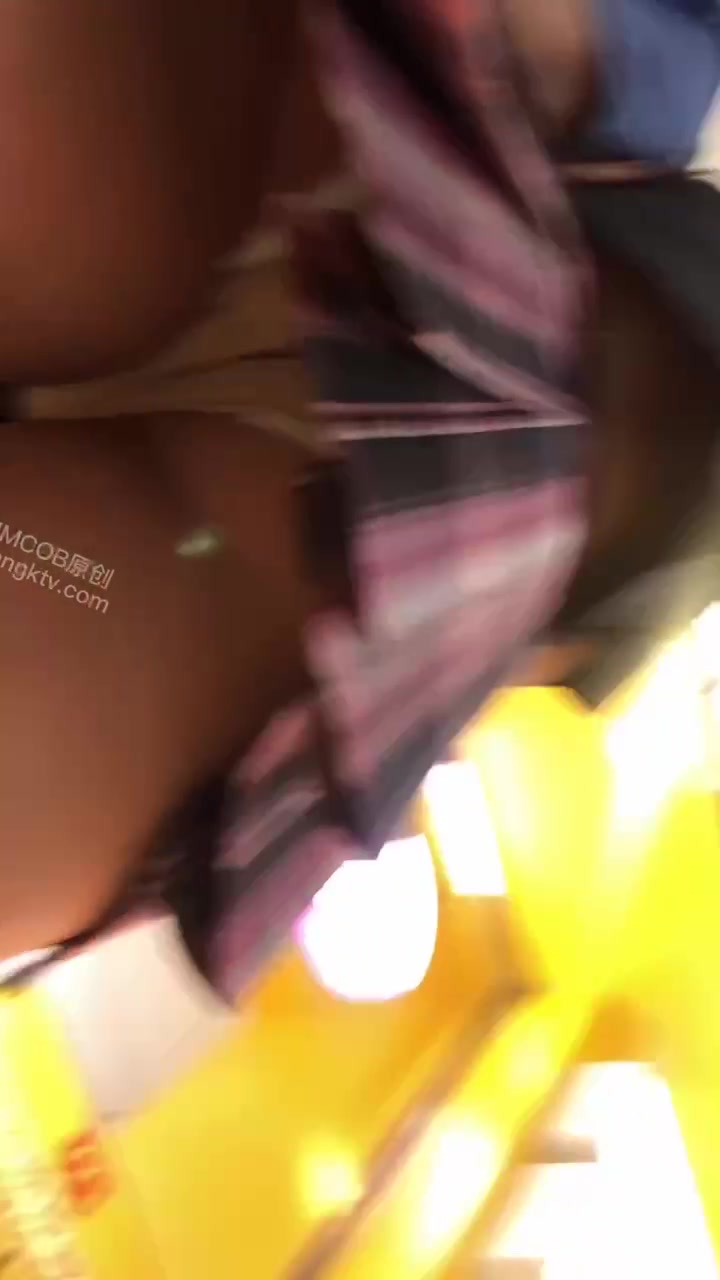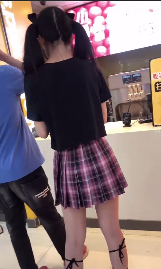 麦当劳格子短裙少女点单,黑丝+白色内裤紧勒翘臀被低角度抄底全露