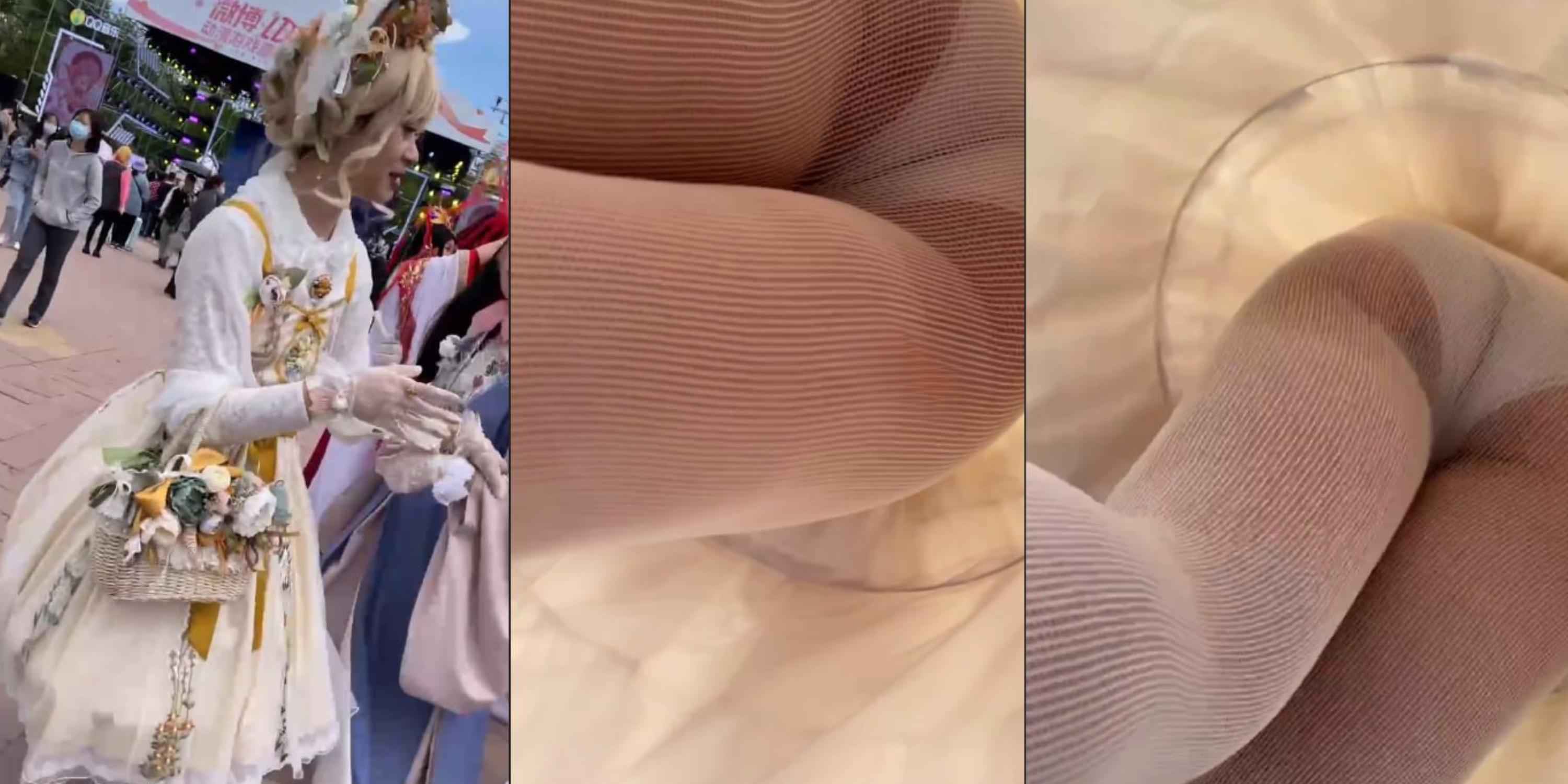 漫展网袜coser抄底偷拍!白内裤蕾丝边卡进臀肉,网袜纹路勒出细密肌理
