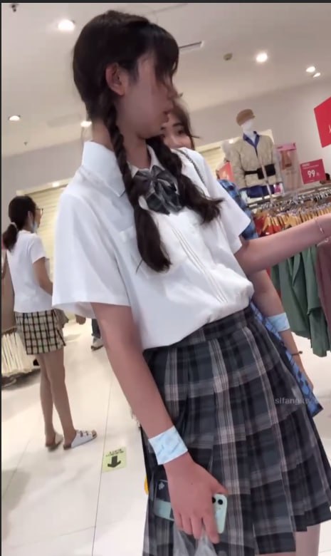 服装店JK制服少女抄底偷拍!白色内裤局部泛黄贴合私处,臀部肌肤被布料勒出浅浅弧线