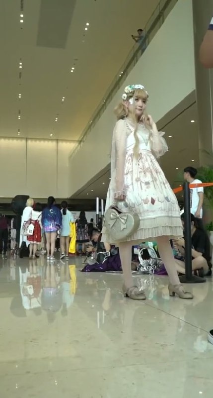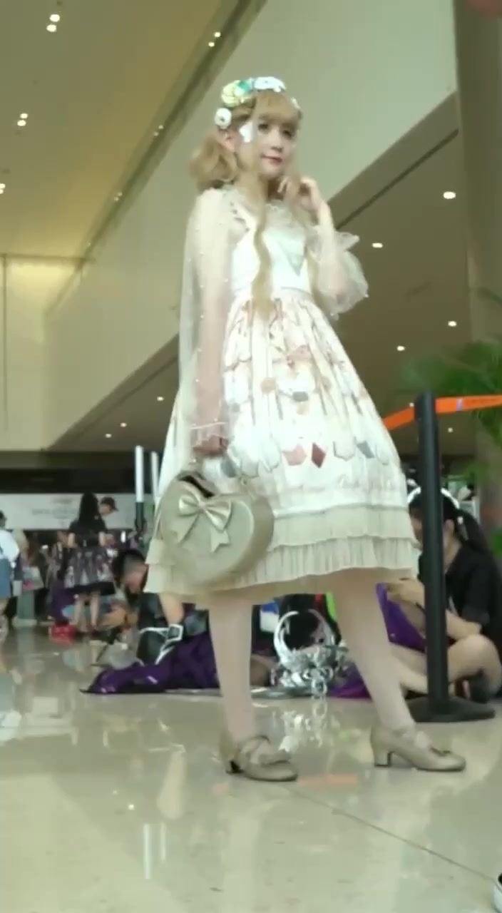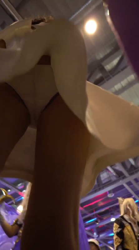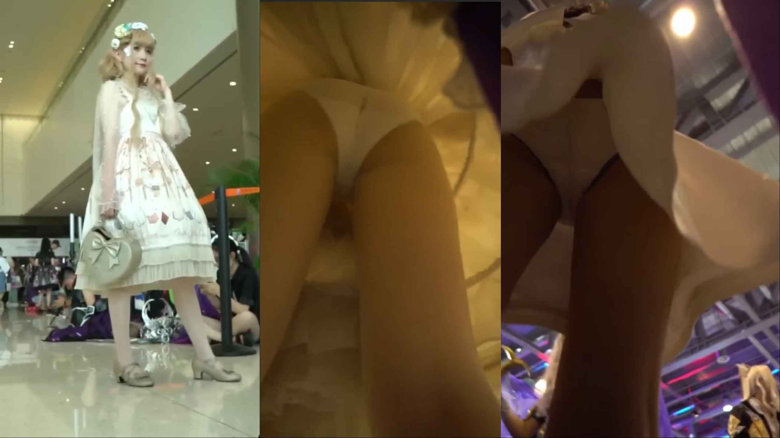 漫展洛丽塔白裙少女摆姿势,黑内裤勒痕+翘臀曲线被低角度抄底全露