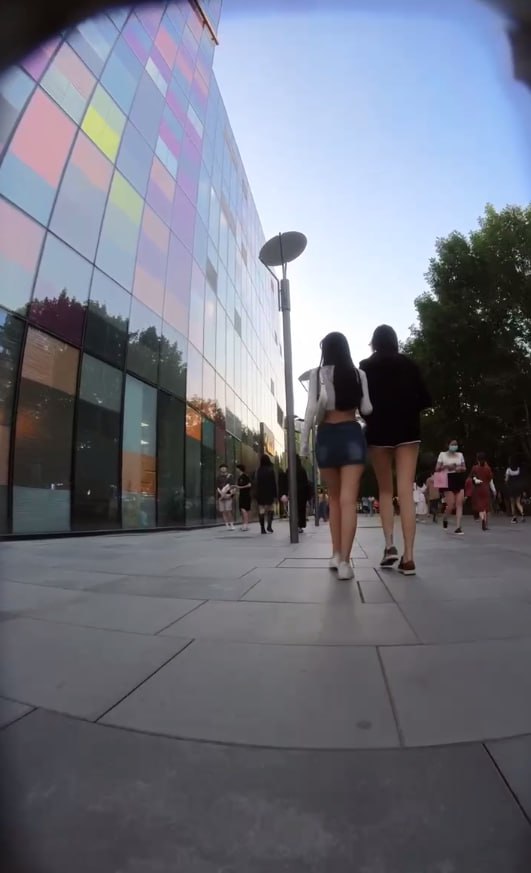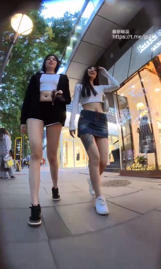 街头姐妹花热裤+牛仔短裙并肩走,黑色内裤紧勒翘臀被低角度抄底全露