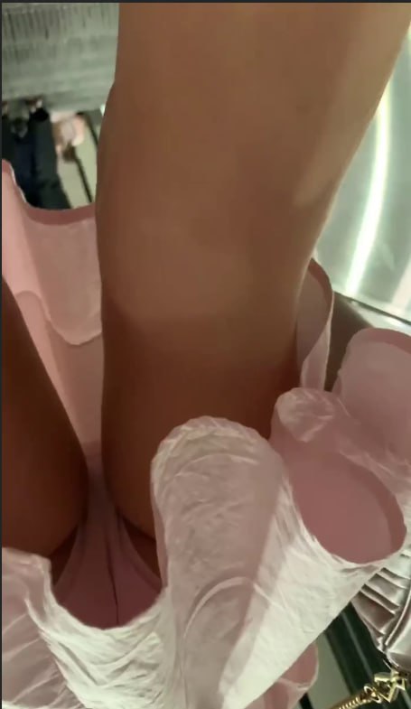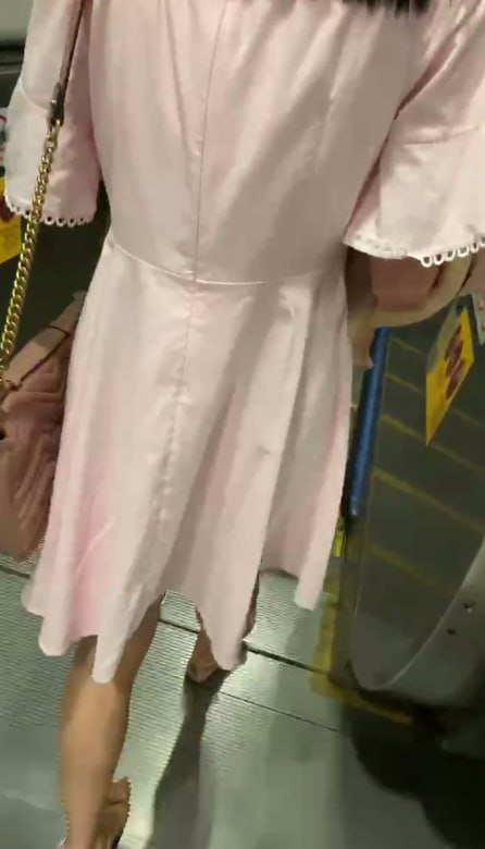 扶梯粉裙少女上升,裙底粉色内裤紧勒翘臀被低角度全程抄底全露