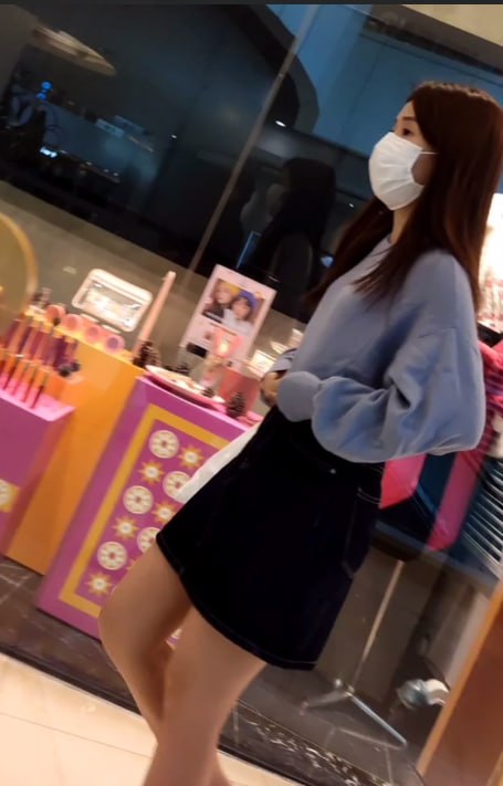 扶梯蓝外套黑短裙美女上升,裙底灰色内裤紧勒翘臀被低角度抄底全露