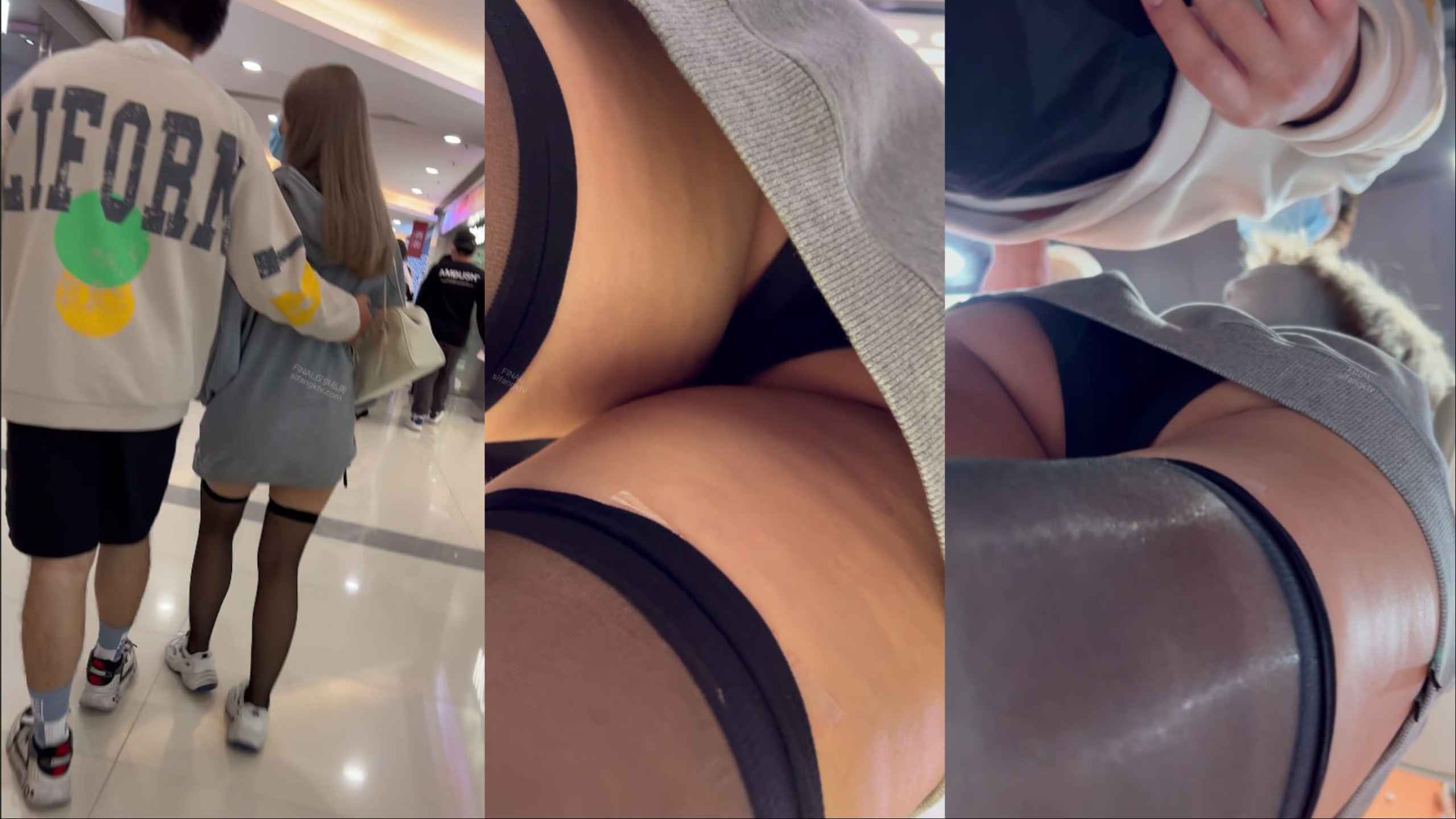 商场黑丝长筒袜小姐姐和男友逛街,短裙下黑色内裤紧勒翘臀被低角度抄底全露