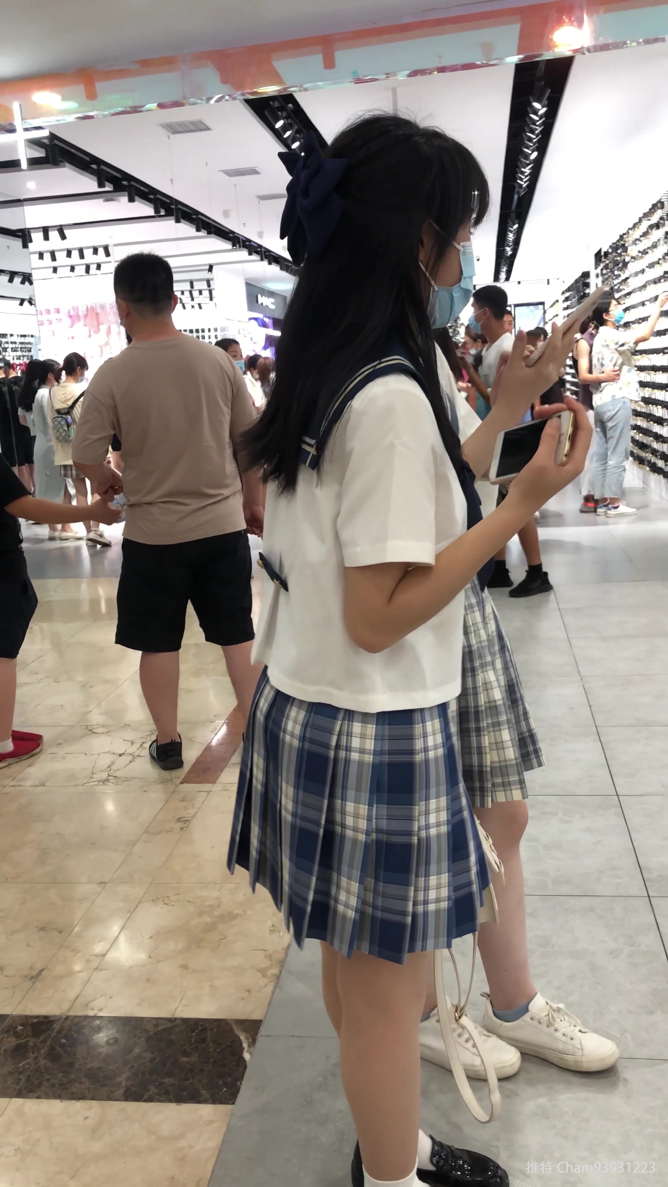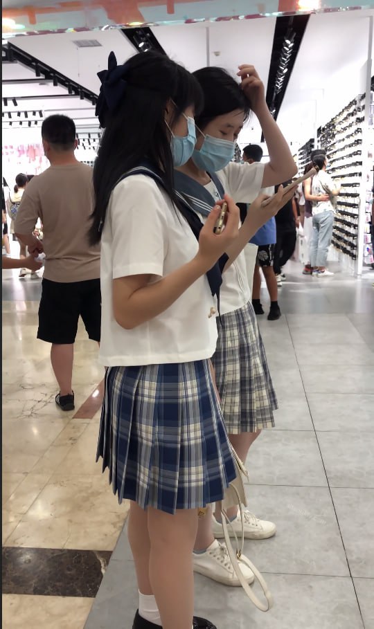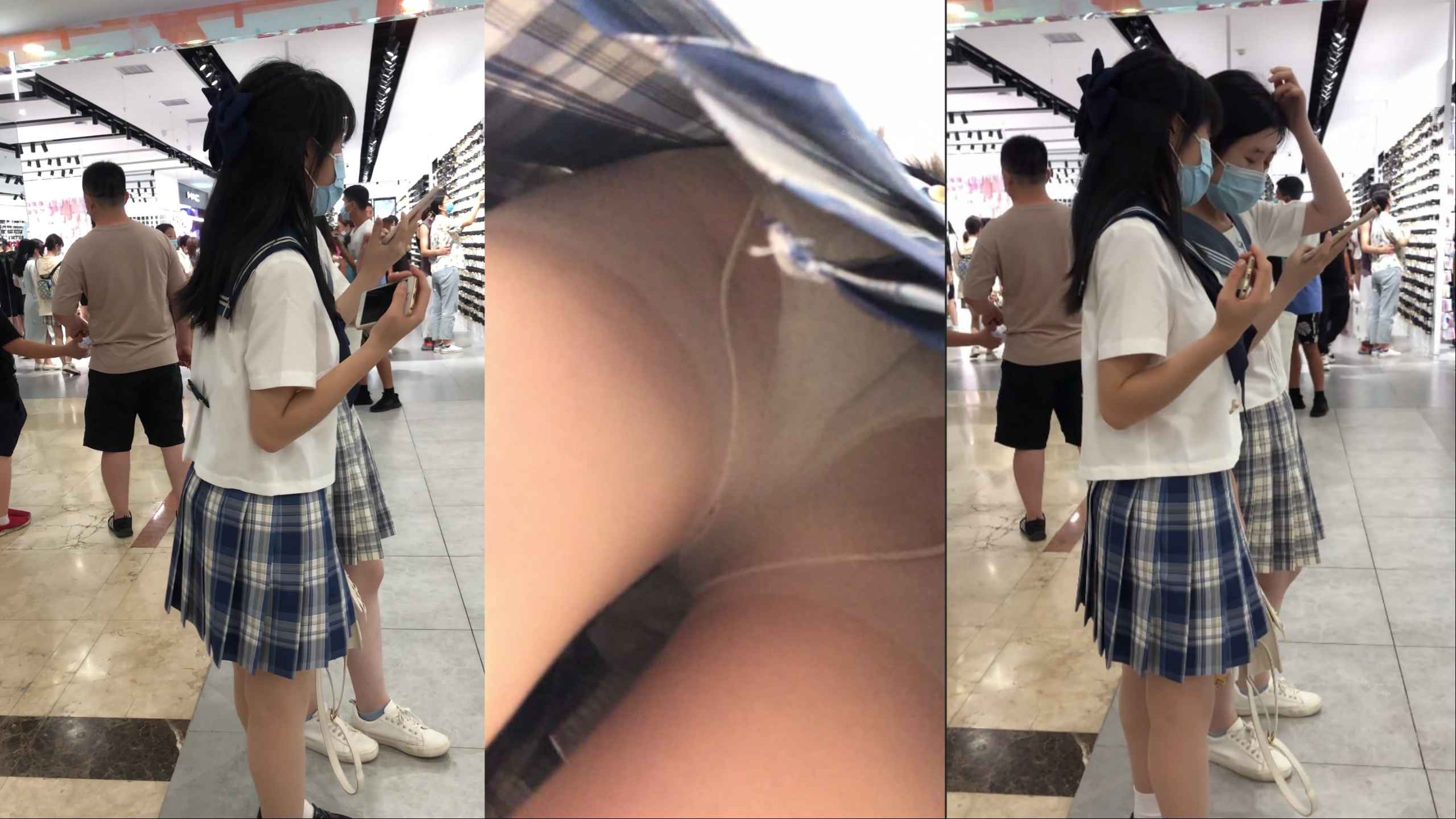 JK小姐姐和闺蜜商场自拍,肉色丝袜+蕾丝内裤紧勒翘臀被低角度抄底全露