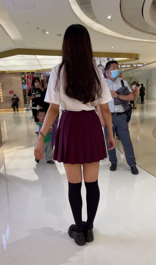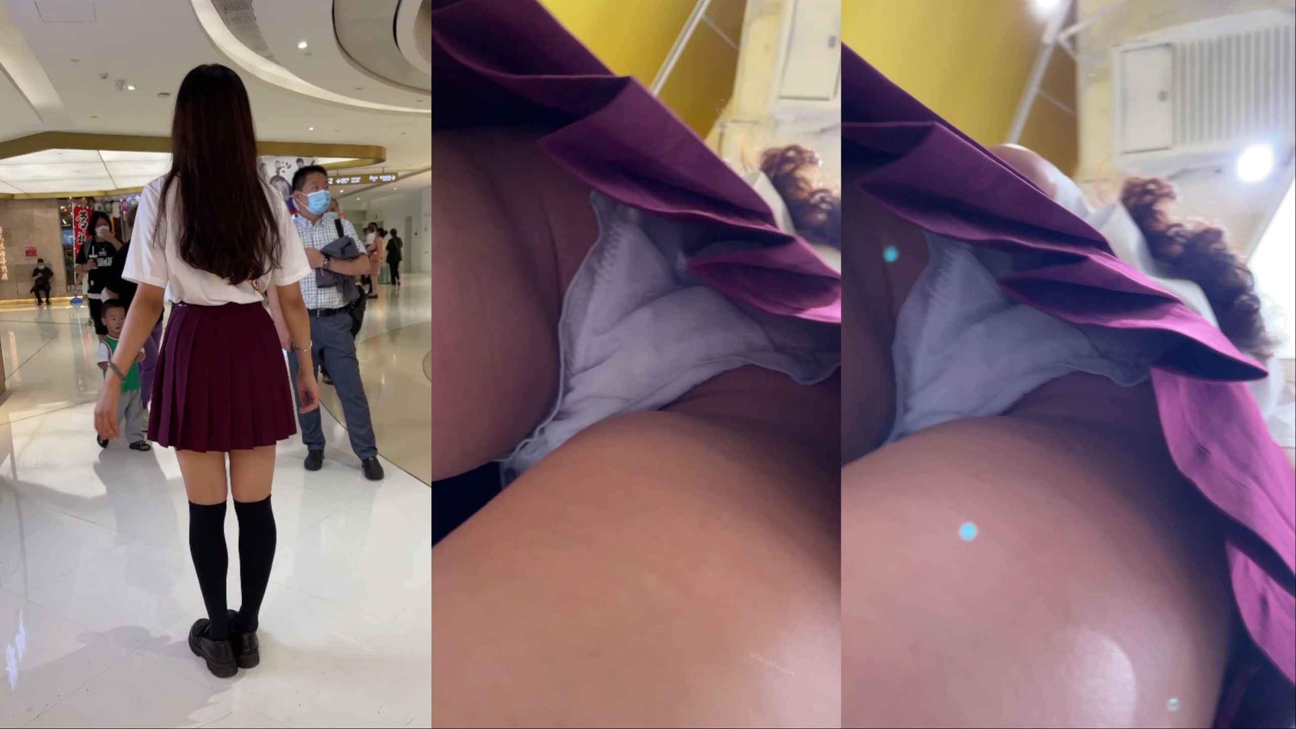 JK眼镜妹和男友商场逛街,超短百褶裙前后掀起花边内裤被低角度抄底全露