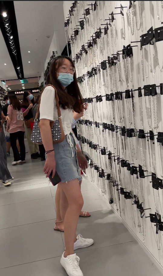商场牛仔短裙小姐姐伸手挑饰品,绿色内裤鼓鼓紧勒私处被低角度抄底全露