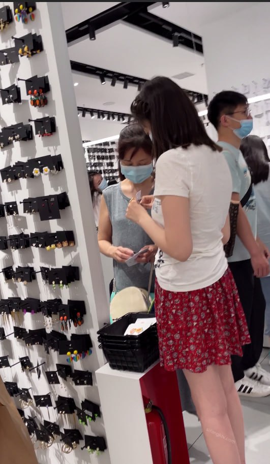 饰品店刚成年小妹妹挑耳环,短裙宽松内裤侧边全露被低角度抄底