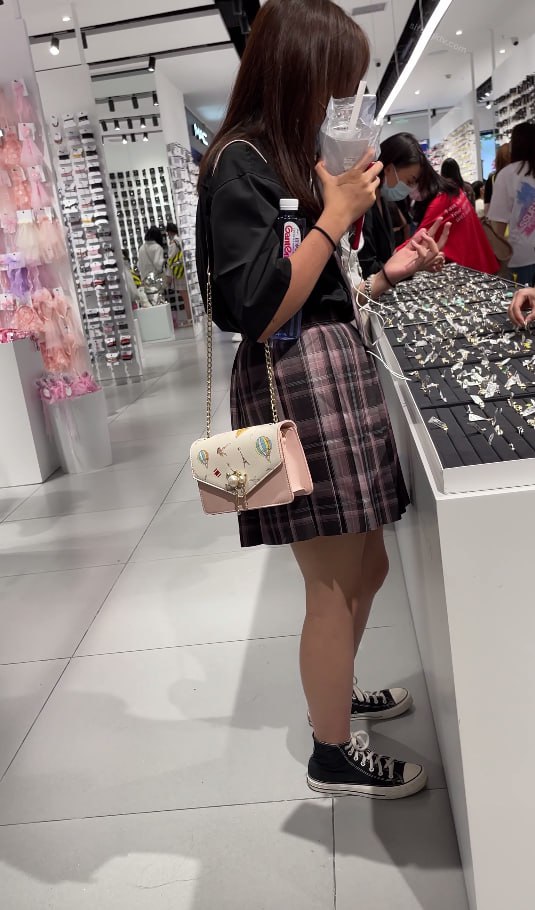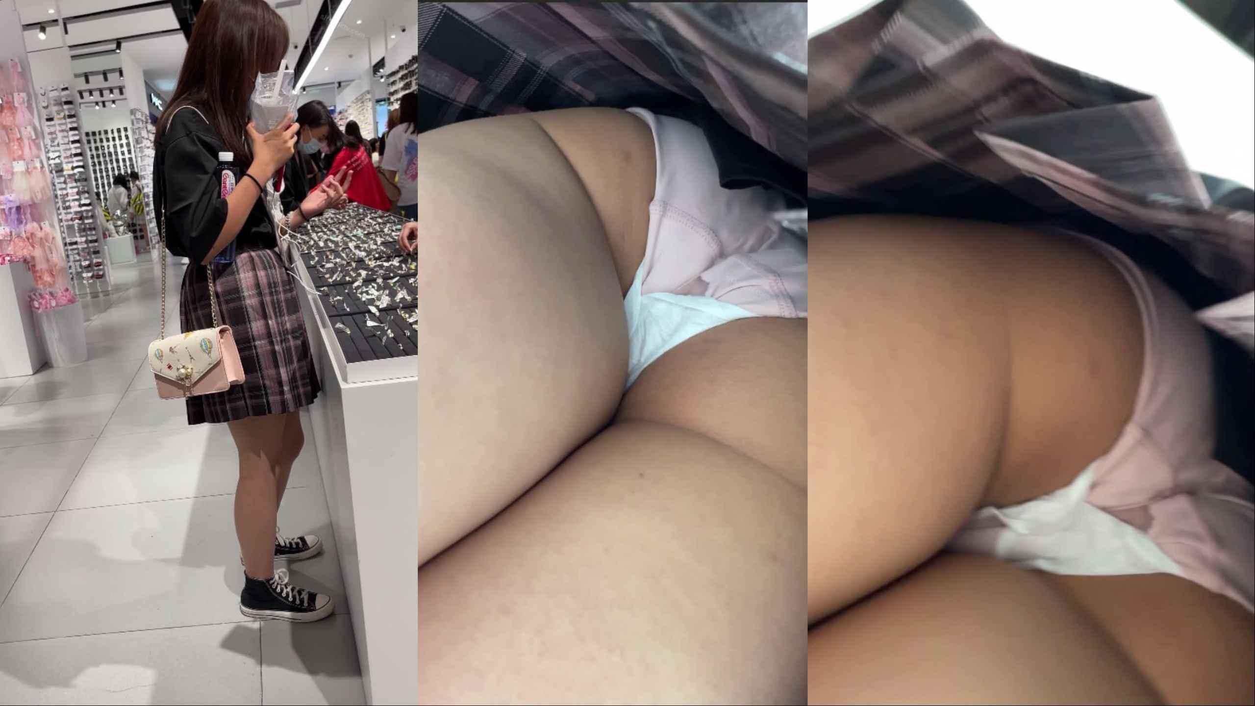 JK小姐姐逛街粉色小翅膀内裤,裙底超清勒痕被低角度抄底全露