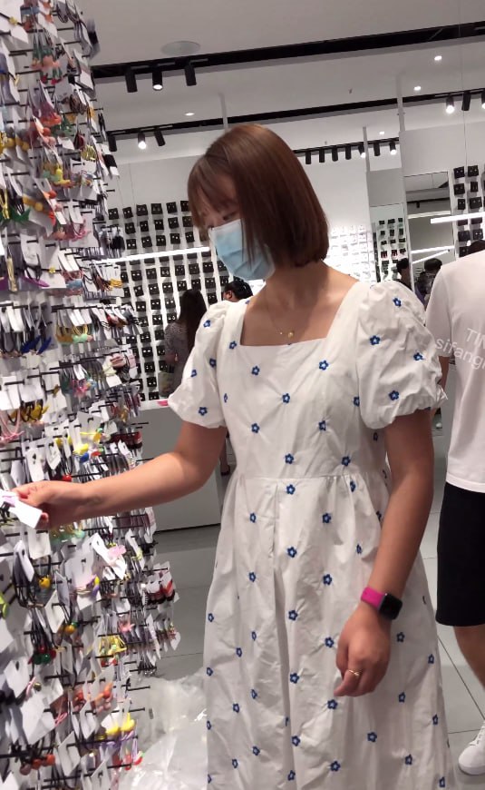 白裙可爱小姐姐挑耳环,卡通米色内裤紧贴翘臀被低角度抄底全露