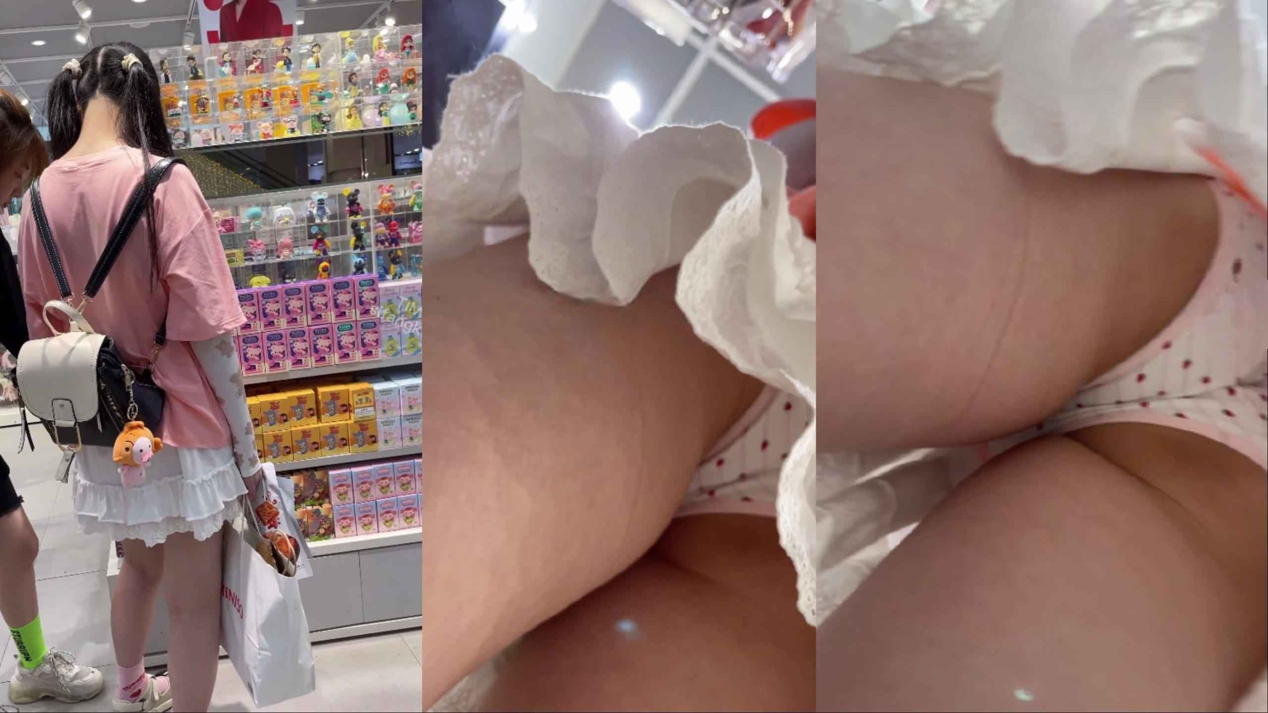 白裙可爱波点小姐姐逛玩具店,波点白内裤紧勒翘臀被低角度抄底全露