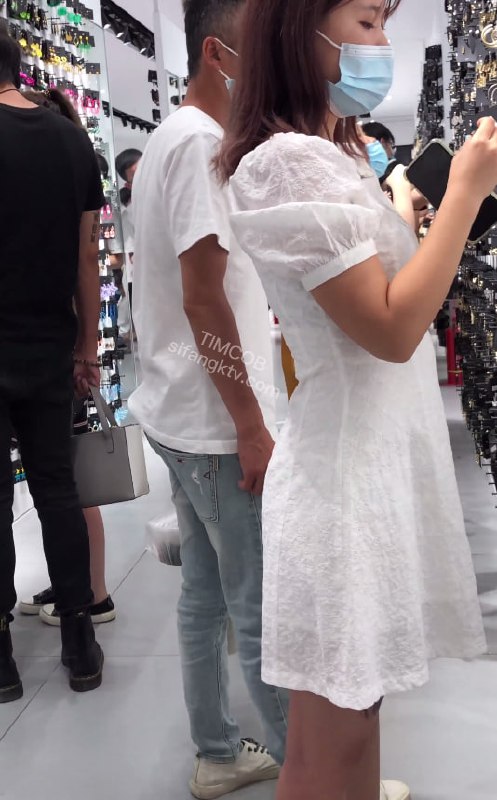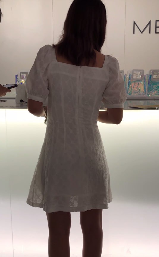 白裙卡通白内裤小姐姐逛饰品,裙底可爱图案全露被低角度抄底