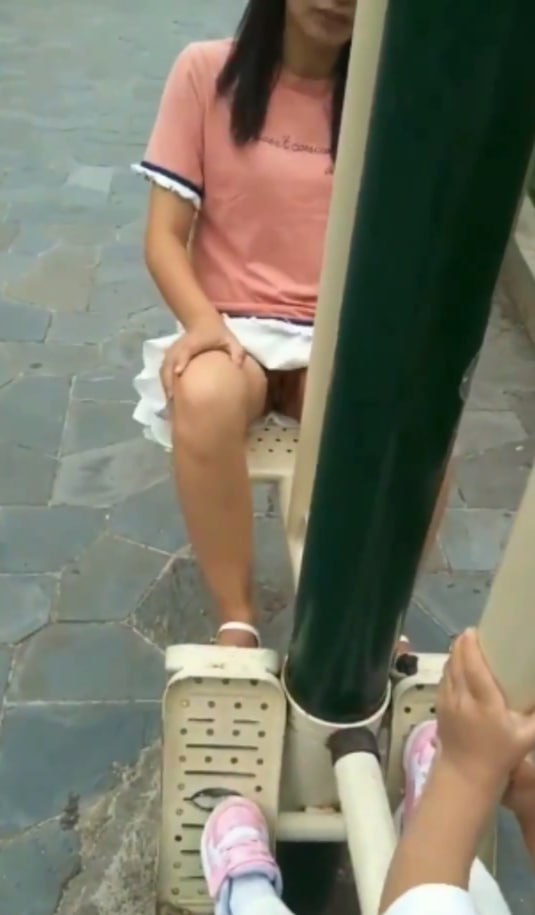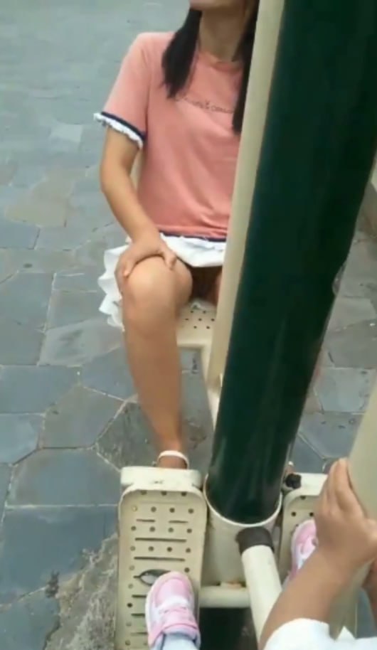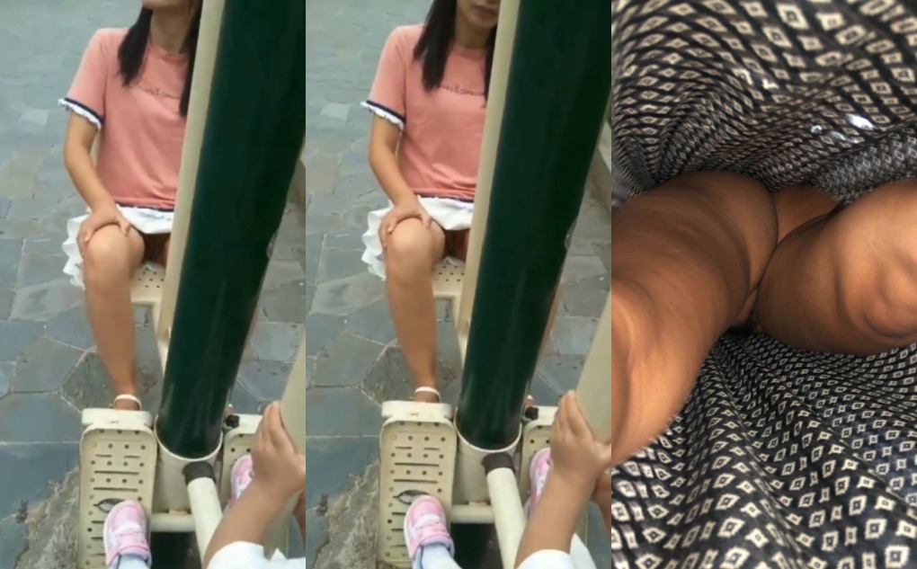 公园健身器材无内双人抄底!少女无毛鲍鱼光滑粉嫩,少妇阴毛浓密私处鼓胀春光齐露