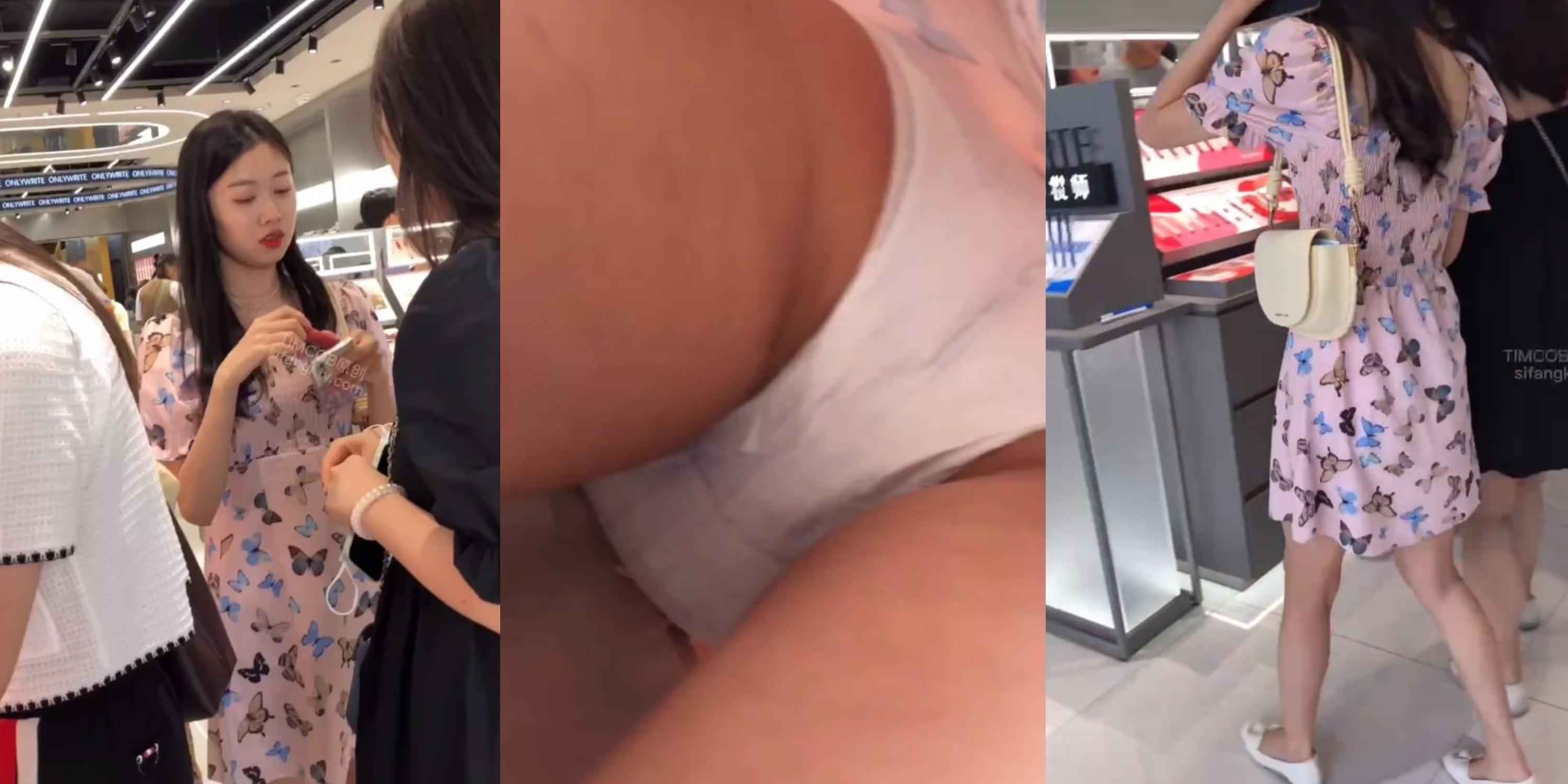 蝴蝶粉裙美女逛街抄底!白色蕾丝内裤勒进翘臀,腿根春光全露太诱人